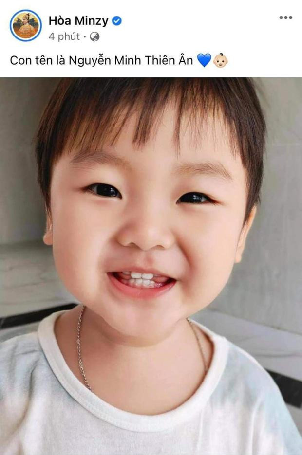 Mới đây, trên trang cá nhân, sau khoảng thời gian dài giấu kín, Hòa Minzy đã chính thức tiết lộ tên thật của bé Bo khiến nhiều người bất ngờ. Theo đó, nữ ca sĩ chia sẻ họ tên đầy đủ của con trai là Nguyễn Minh Thiên Ân. Bên cạnh đó, Hòa Minzy cũng cho biết thêm gia đình mình theo Công giáo, tên thánh của con là Vicente và xuất phát điểm của cái tên Thiên Ân cũng chính là ẩn ý về Hồng Ân của Chúa.