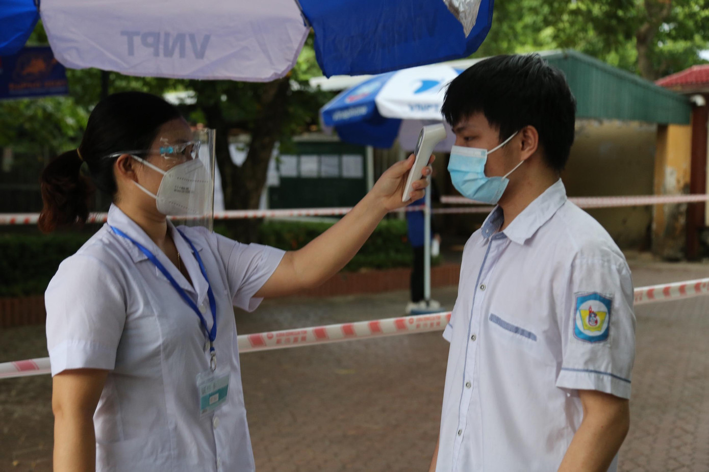 Trước khi vào phòng thi, các thí sinh được nhân viên y tế đo thân nhiệt, thanh niên tình nguyện phân phát khẩu trang, rửa tay sát khuẩn.