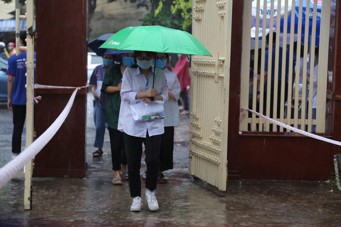 Từng nhóm thí sinh cùng che ô dù tránh mưa vào phòng thi.