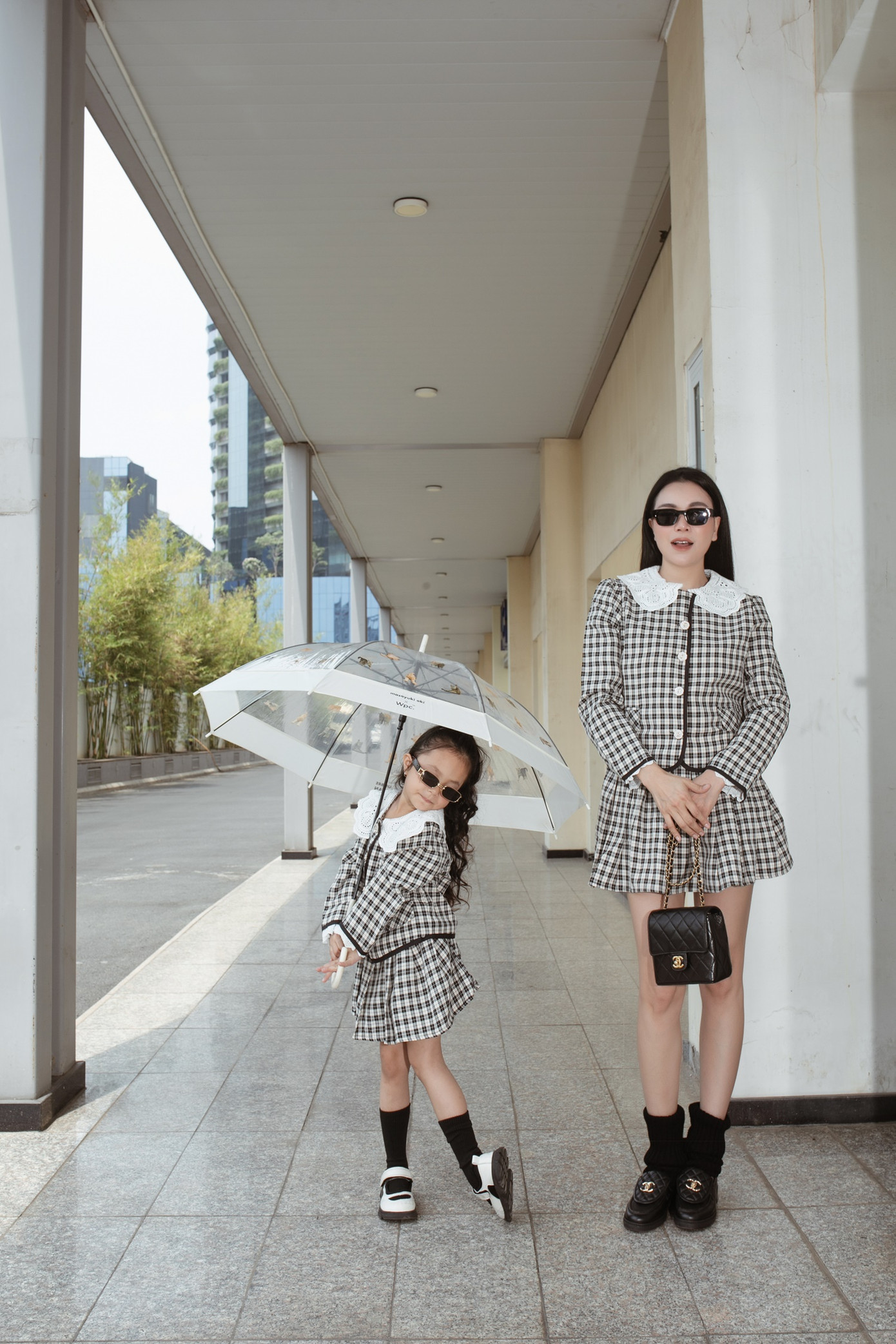 Cả hai mẹ con Trà Ngọc Hằng ăn diện ‘ton sur ton’ từ tông màu, họa tiết đến chất liệu. ‘Mỹ nhân’ này cùng con gái dần trở thành cặp mẹ con sành điệu nhất nhì showbiz Việt.