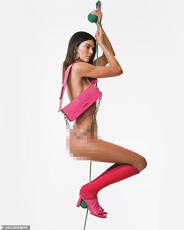 Jacquemus - Nhà thiết kế tài năng người Pháp vừa tung lên trang cá nhân hình ảnh "siêu mẫu đắt giá nhất thế giới" Kendall Jenner khỏa thân hoàn toàn, tạo dáng thẳng đứng cùng một sợi dây, chiếc túi hồng che phần ngực.