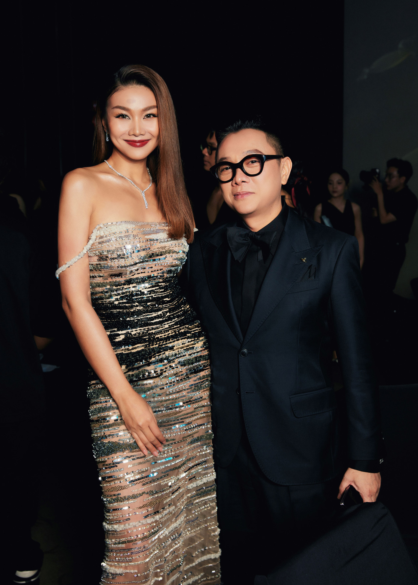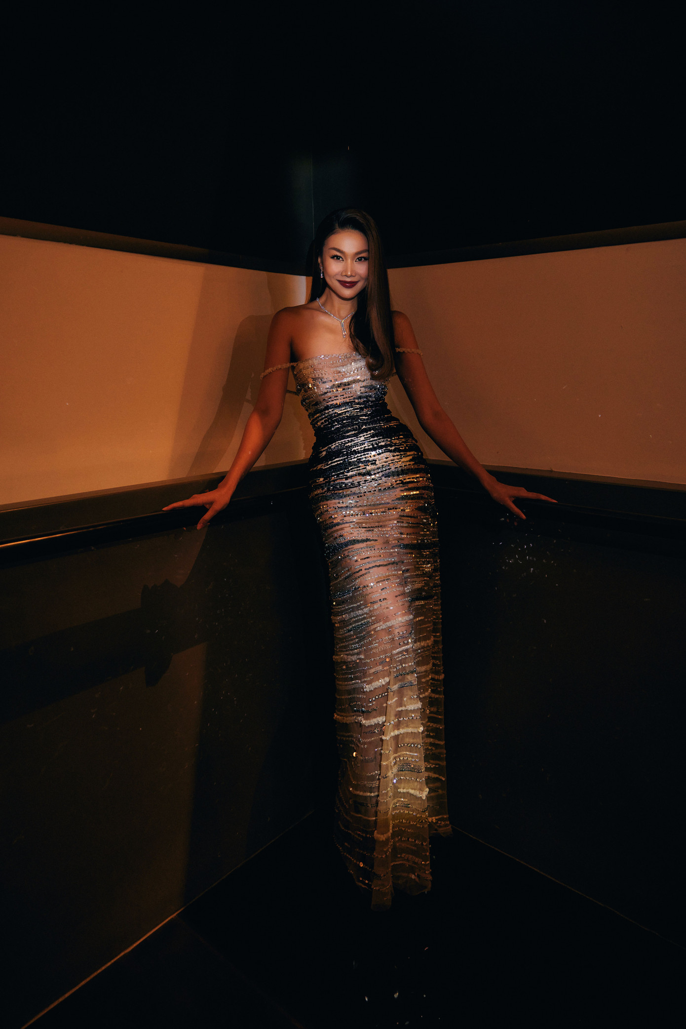 Thanh Hằng diện bộ đầm hai dây của NTK Võ Tiến Đạt, có phần thân dưới ‘xuyên thấu’ rất gợi cảm. Siêu mẫu được khen trẻ trung, với mái tóc xõa thẳng tắp. Khi xuất hiện tại sự kiện, Thanh Hằng được rất nhiều khán giả gọi tên cổ vũ. Trên thảm đỏ, người đẹp hội ngộ nhiều đồng nghiệp, bạn bè nghệ sĩ.