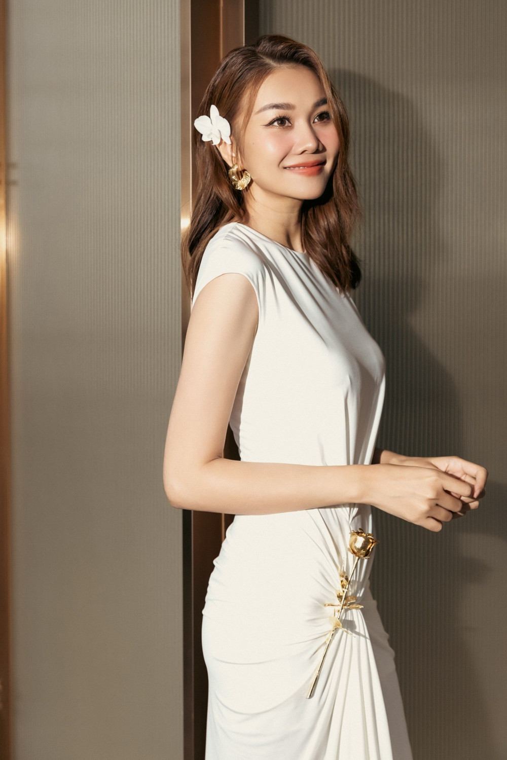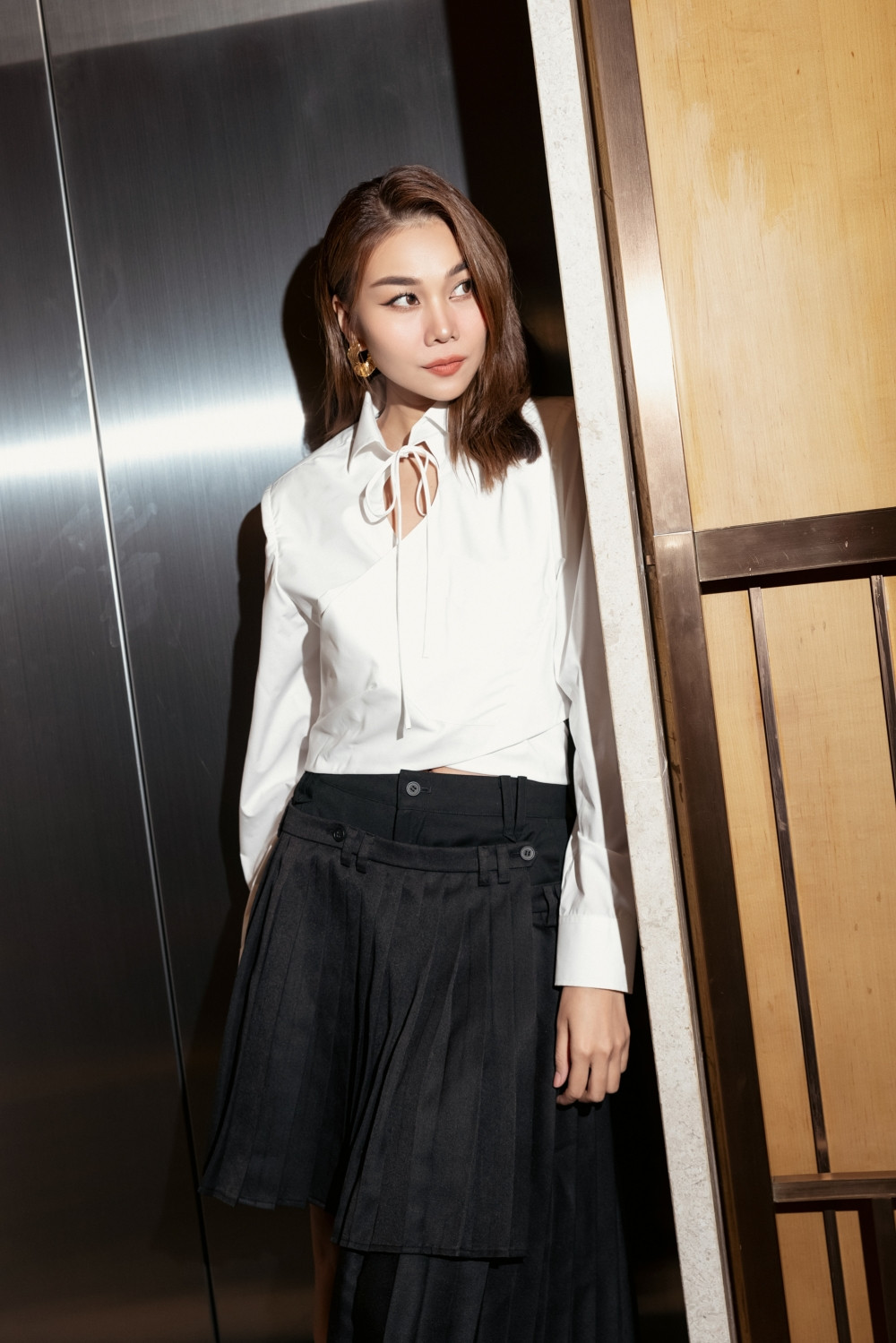 Tại sự kiện buổi sáng do một thương hiệu mỹ phẩm tổ chức, Thanh Hằng diện bộ đầm trắng ôm sát với điểm nhấn ở eo. Buổi trưa, khi làm giám khảo chấm điểm bình chọn về làm đẹp của một tạp chí nước ngoài tại Việt Nam, Thanh Hằng diện sơ mi trắng mix cùng chân váy đen xếp ly.