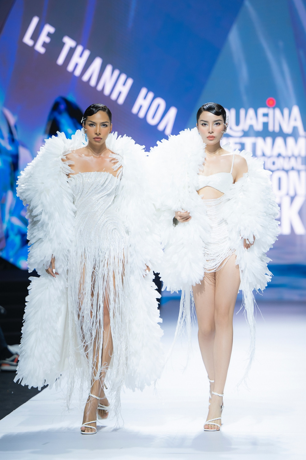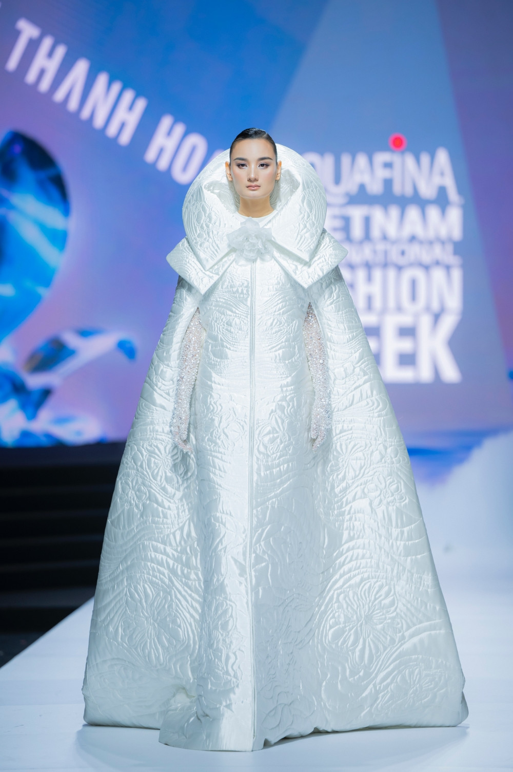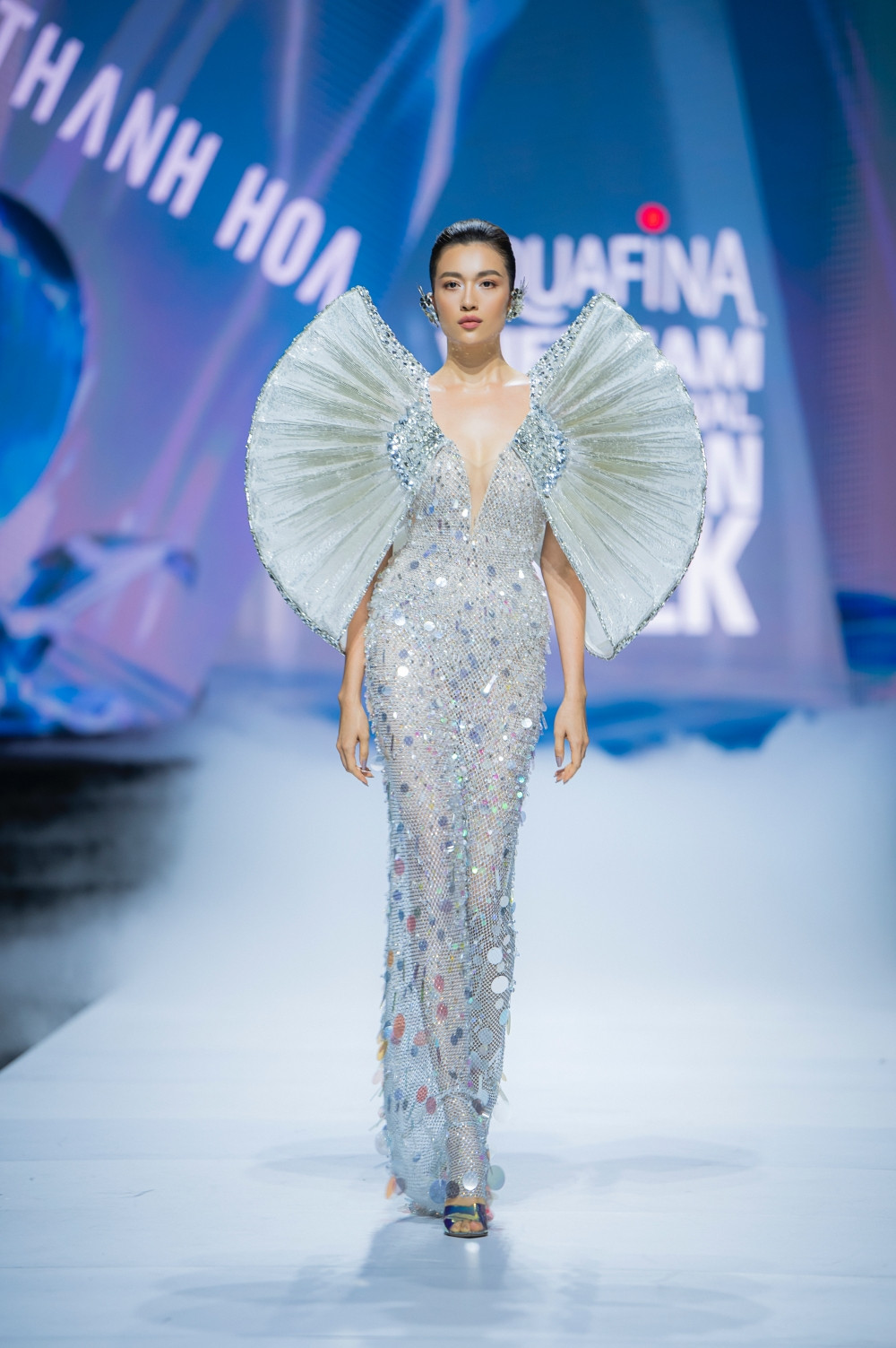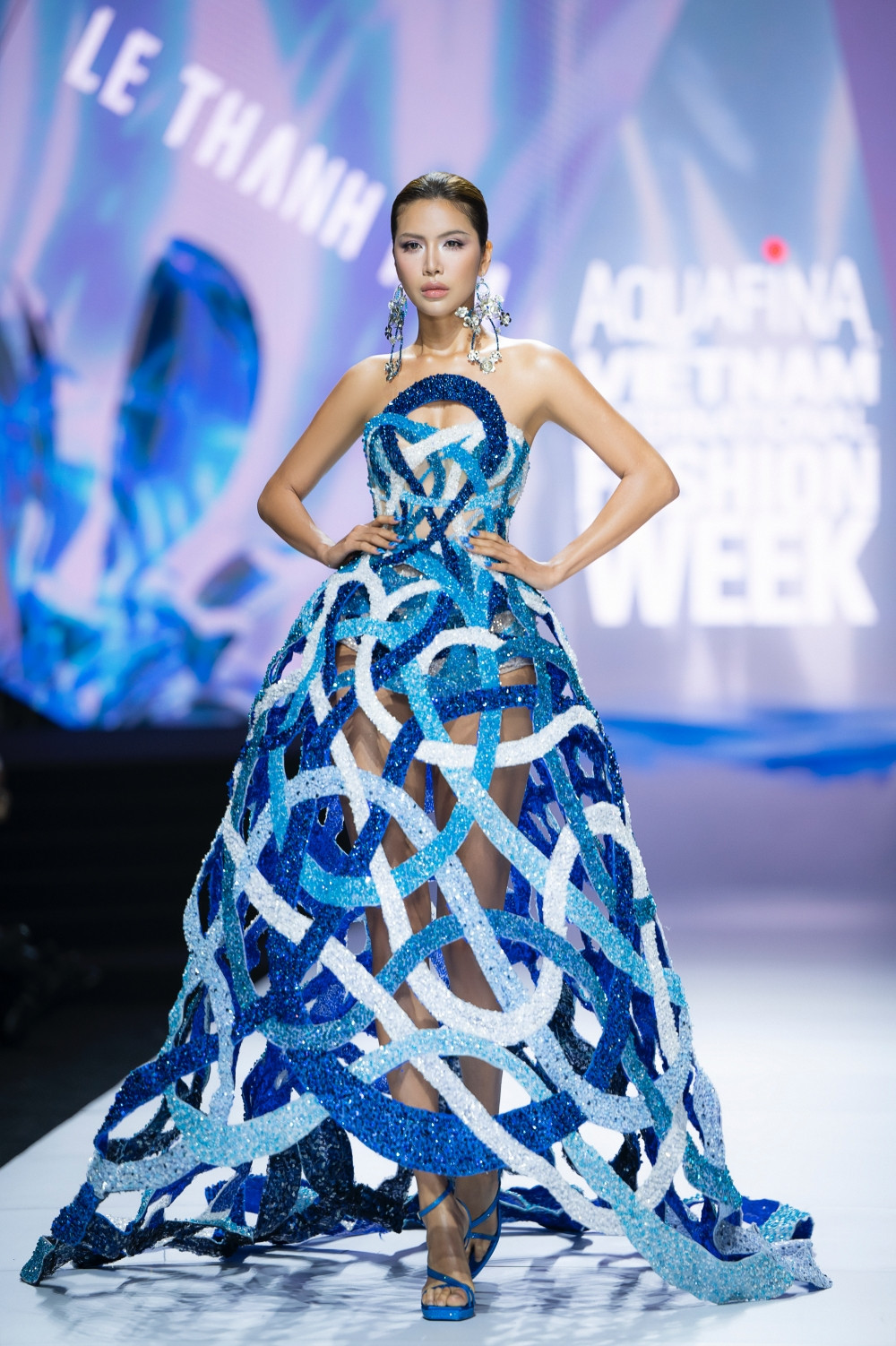 Không ngoài dự đoán, vedette của show chính là siêu mẫu Thanh Hằng. NTK Lê Thanh Hòa đã dành cho Thanh Hằng thiết kế độc đáo, đó chính là bộ váy đính hàng ngàn viên pha lê, lấy cảm hứng từ những giọt nước tinh khôi và thuần khiết. Bộ đồ tuy nặng hơn 50kg nhưng không thể làm khó những bước catwalk chuyên nghiệp của siêu mẫu Thanh Hằng.