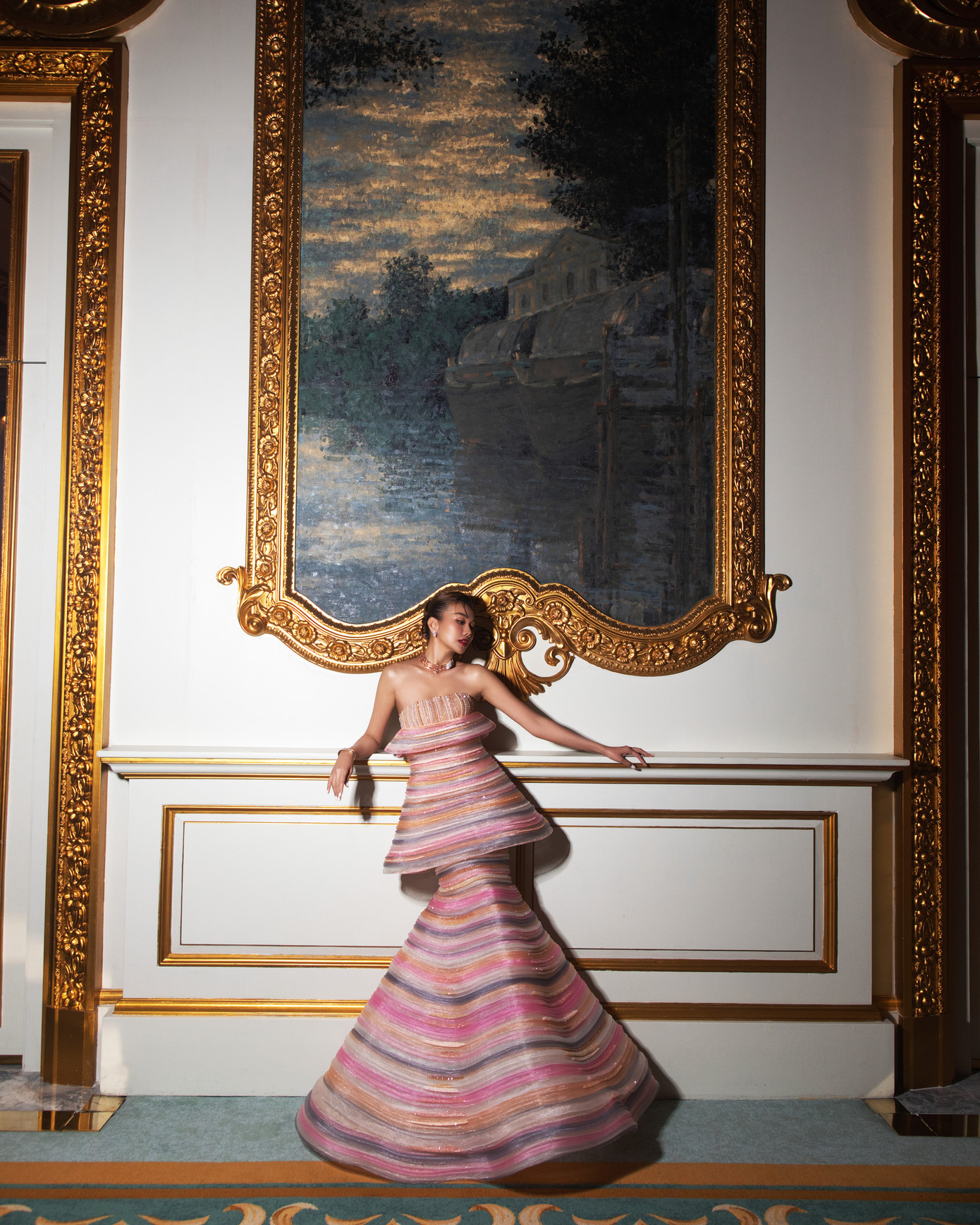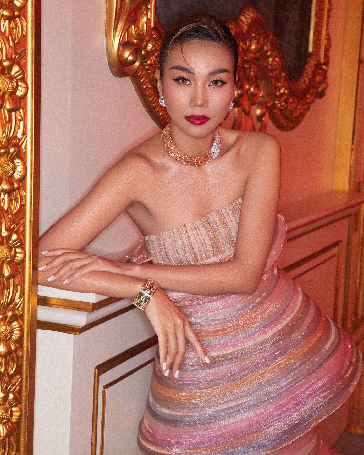 Cô hoàn thiện vẻ ngoài bằng phụ kiện là bộ trang sức tiền tỷ đầy quyền lực, nổi bật với dây chuyền kết hợp hài hòa giữa vàng hồng và vàng trắng, nạm với những viên ngọc lục bảo và kim cương. Điểm nhấn của chiếc dây chuyền là ‘đôi mắt’ được đúc kết bởi một cặp ngọc lục bảo hình giọt nước, mỗi viên nặng 0,35 carat.