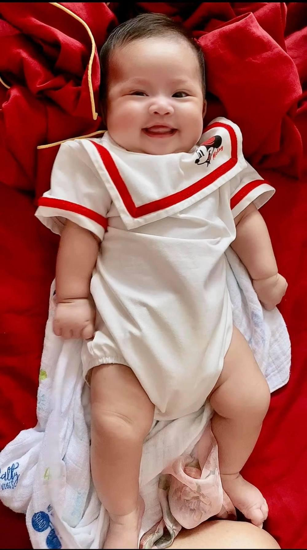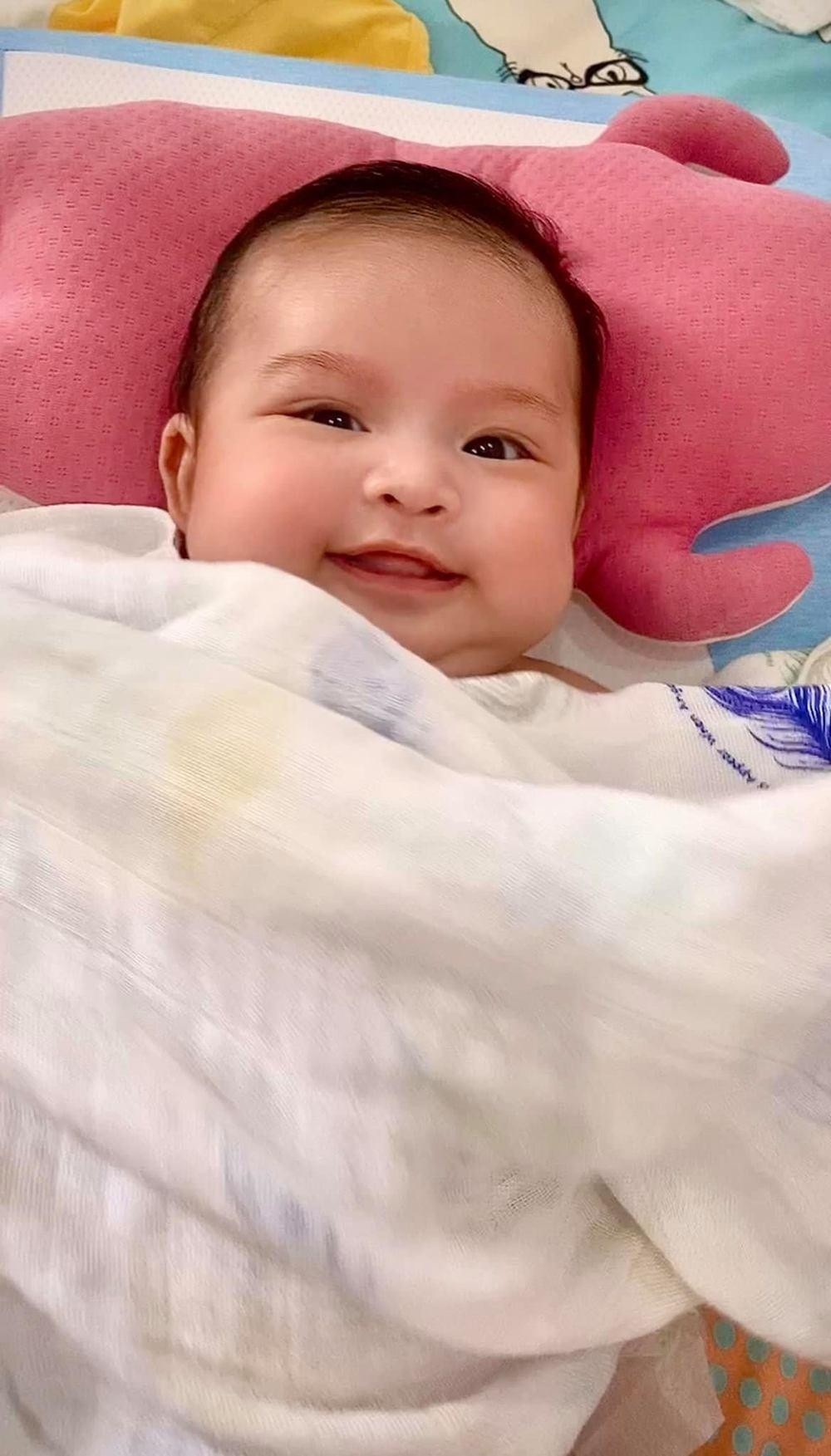 Cô vui vẻ tâm sự: "Thiên thần bé con xuất hiện trong tình hình căng thẳng để mong mang đến cho các cô chú những nụ cười tẹt ga giống như con ạ. Chỉ cần các con luôn vui khoẻ như thế mẹ có bớt đi tuổi thọ cũng được nữa!". Nhân dịp này, cô cũng hé lộ em bé là con gái, rất dễ thương và có nhiều nét nhìn giống con trai cả của Vy Oanh.