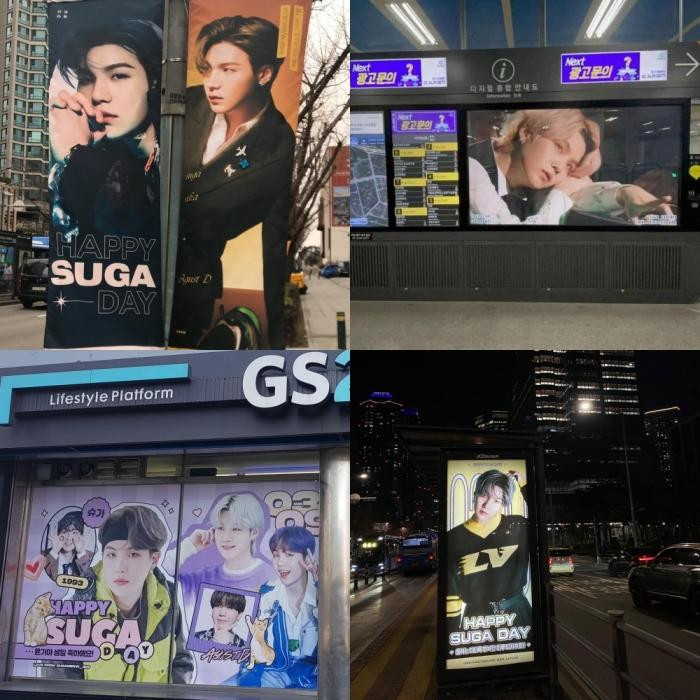 Hình ảnh SUGA những ngày này tràn ngập khắp thủ đô Seoul, Hàn Quốc, từ các trung tâm thương mại, trên đường phố, các trạm tàu điện ngầm và cả trong các tàu điện ngầm, cửa hàng tiện lợi và xung quanh toà nhà trụ sở HYBE, công ty chủ quản của BTS.