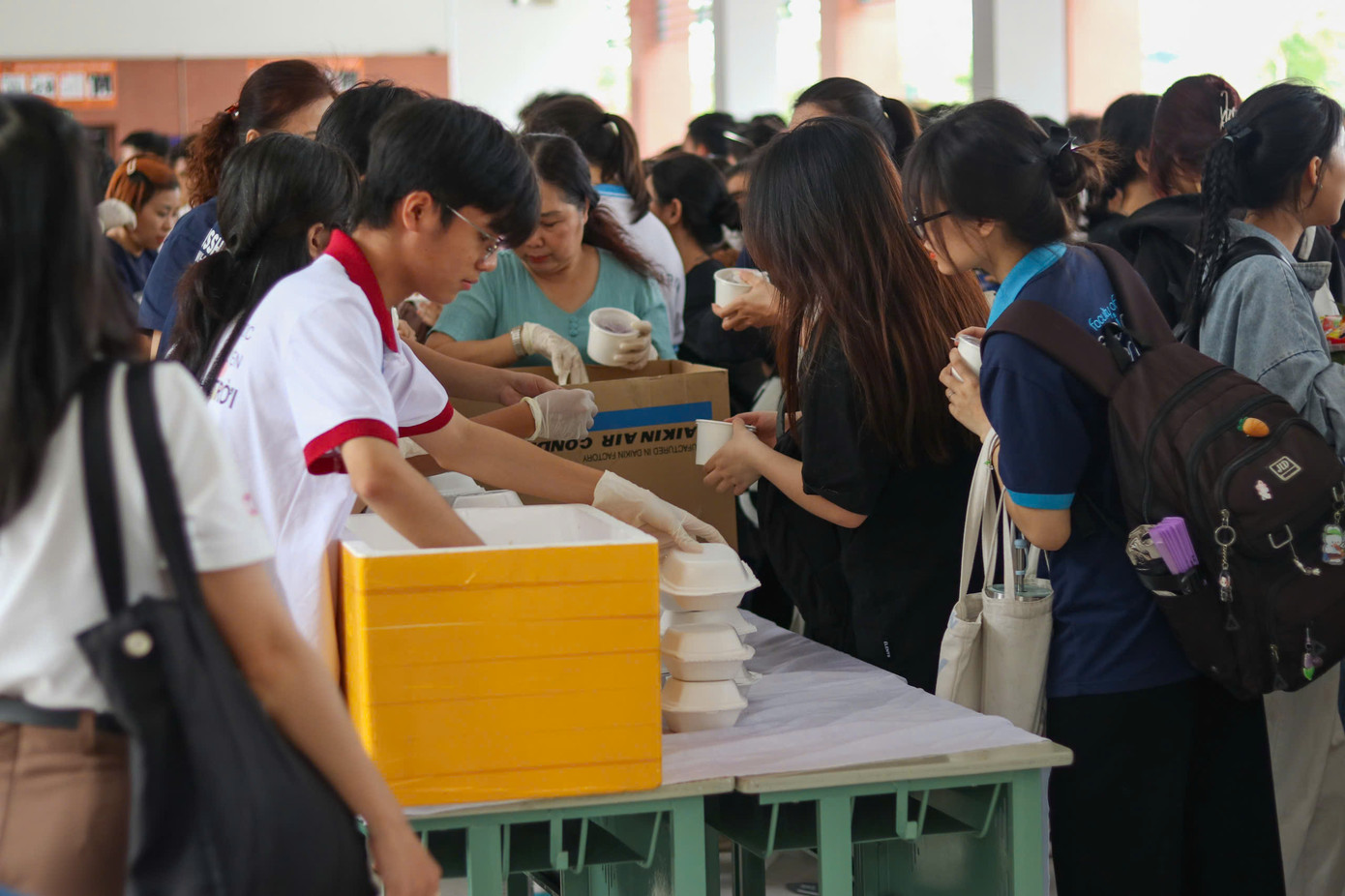 | Sinh viên đến nhận phần ăn trưa từ các giảng viên. |