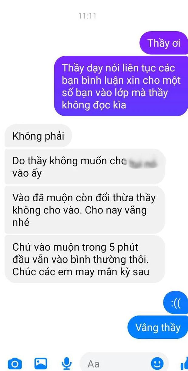 Lý do mà thầy được ra cũng vô cùng thuyết phục khiến các bạn này không thể nài nỉ thêm. Thầy sẵn sàng dành ra 5 phút đầu giờ cho các bạn có trục trặc máy móc hay lỗi phát sinh vào sau. Nhưng nhóm bạn này đã vào muộn rồi còn đổ thừa cho thầy giáo không cho vào: "Thầy dạy nói liên tục các bạn bình luận xin cho một số bạn vào lớp mà thầy không đọc".