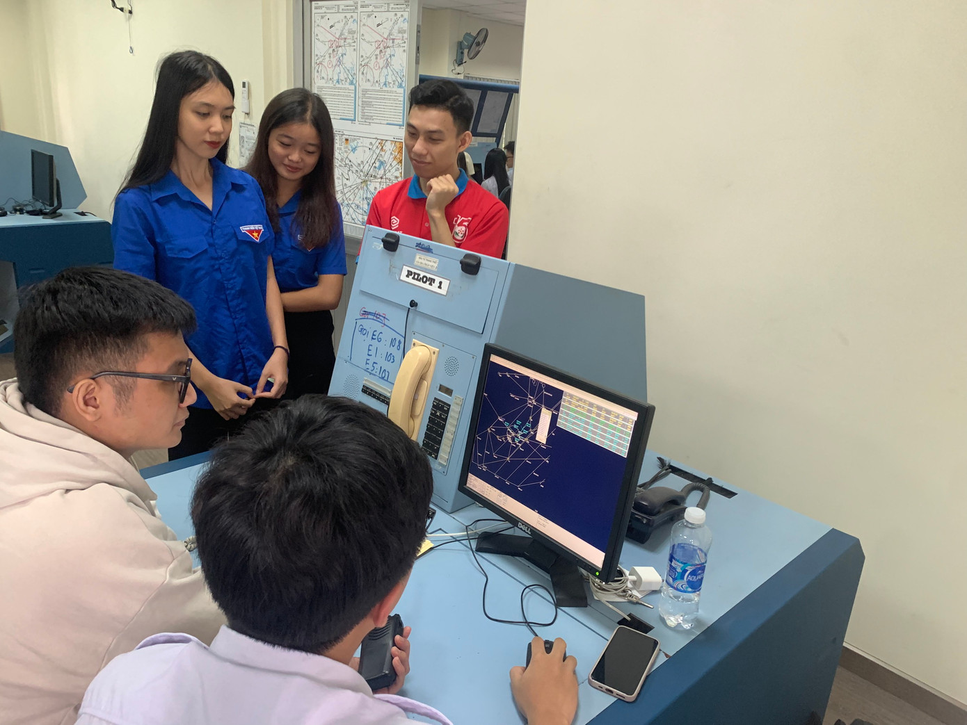 Đoàn viên, đội viên còn được trải nghiệm tại phòng điều khiển thực hành dịch vụ kiểm soát tại sân bay. Đây là phòng thực hành và bổ trợ cho bộ môn kiểm soát tại sân, điều hành cho máy bay cất cánh, hạ cánh. Các em được quan sát giảng viên, sinh viên thực hành điều khiển các lệnh và xử lý tình huống cho máy bay cất cánh, hạ cánh. Phòng này cũng là nơi đảm bảo an toàn khi tàu bay di chuyển trong khu vực sân đỗ, bến đỗ.
