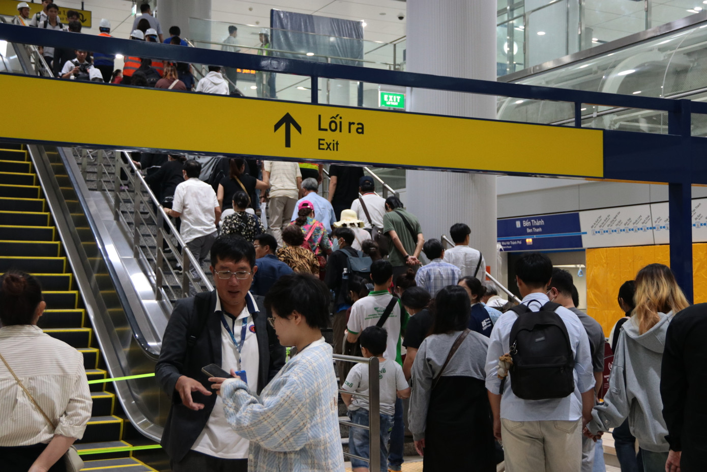 Từ sáng sớm, nhà ga Bến Thành đã đón những lượt khách đầu tiên, trong đó có đông đảo sinh viên. Đối với nhiều bạn sinh viên, đây là trải nghiệm mới lạ khi lần đầu được tham quan nhà ga trung tâm và trải nghiệm ngồi trên tàu Metro số 1.