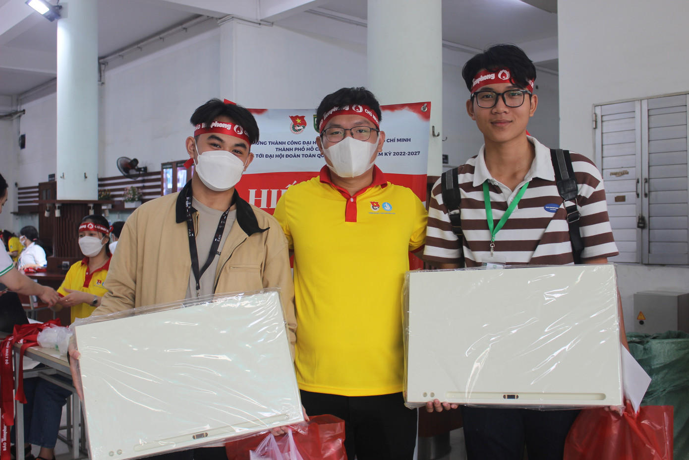 | Để chuẩn bị cho chương trình, các tình nguyện viên trong đội của Phát đã phải chuẩn bị từ hôm trước, từ treo banner, backdrop, kê bàn ghế khu vực hiến máu cho đến chuẩn bị nước uống, phần ăn cho các sinh viên tham gia hiến máu... |
