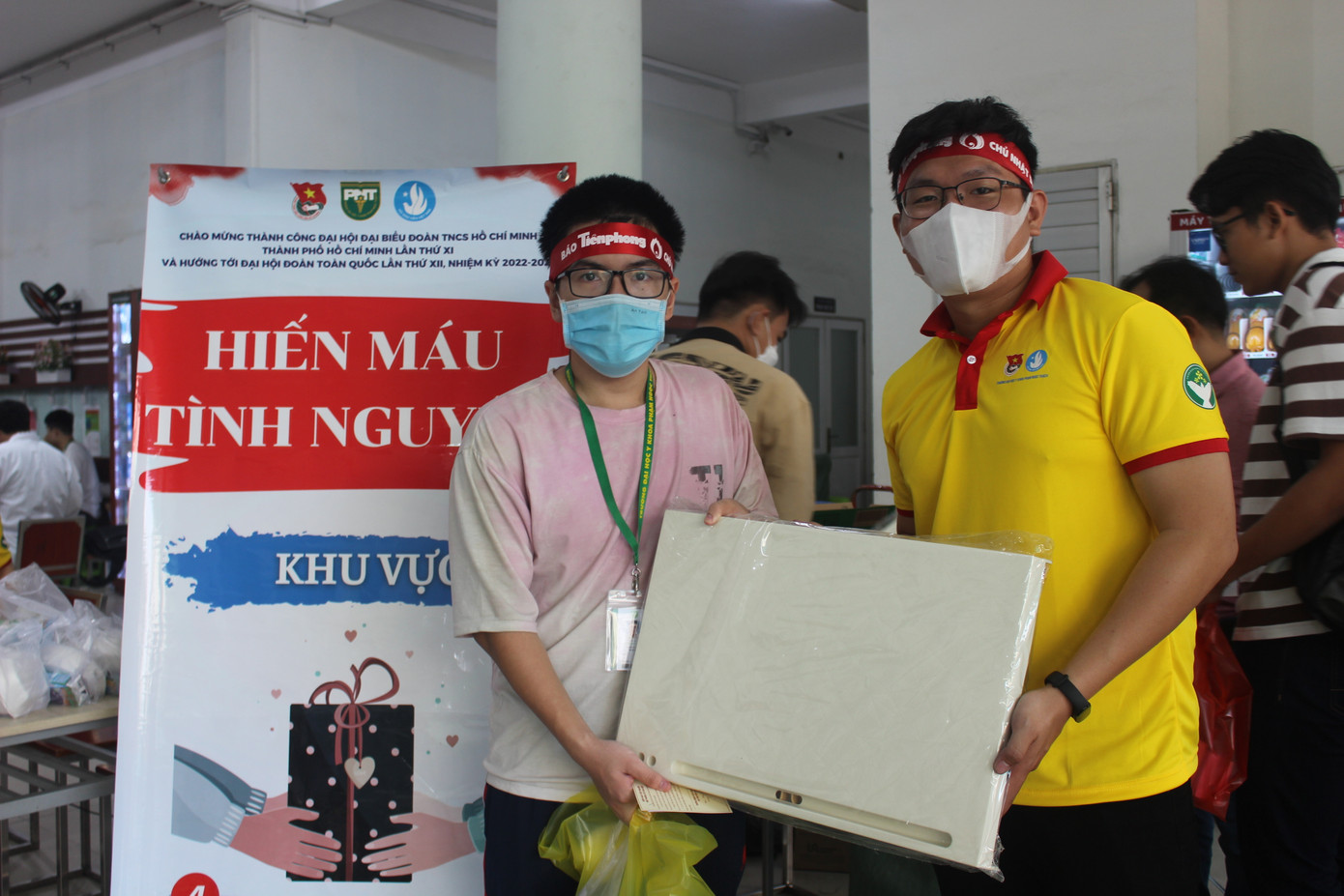 | Các sinh viên hiến máu nhận giấy chứng nhận và quà tặng từ Ban Tổ chức. |