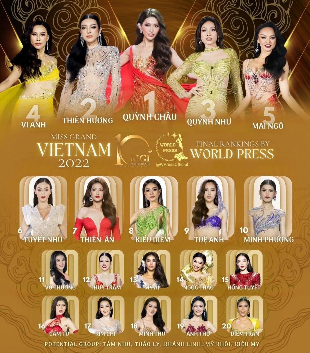 Trong Top 10 dự đoán của chuyên trang World Press còn có những cái tên đình đám khác như Tuyết Như, Thiên Ân, Kiều Diễm, Tuệ Anh, Minh Phượng. Đây đều là những người đẹp sở hữu nhan sắc ấn tượng, kỹ năng trình diễn tốt.