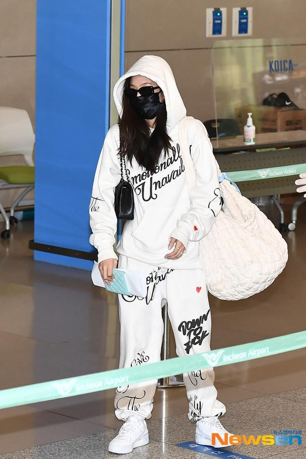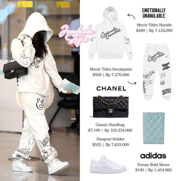 Không hẹn mà gặp, Jennie cũng chọn trang phục tông trắng - đen khi lộ diện ở sân bay Incheon. Bộ đồ thể thao trắng muốt in những dòng chữ to bản của thương hiệu Emotionally Unavailable giá 990 đôla (khoảng 23 triệu đồng) kèm giày Adidas 100 đôla (2,3 triệu đồng).