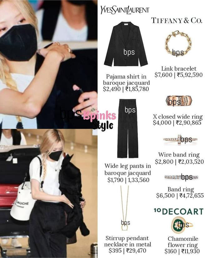 Cách đây vài ngày, Rosé đã trở về Hàn Quốc và diện trang phục trông thì giản đơn nhưng giá thì trên trời. Nguyên set quần và áo khoác của Saint Laurent tính sơ sơ đã tới 4.280 đôla (khoảng 100 triệu đồng). Bộ trang sức Tiffany & Co. gồm dây chuyền, vòng tay đến nhẫn là 21.000 đôla (khoảng 485 triệu đồng).