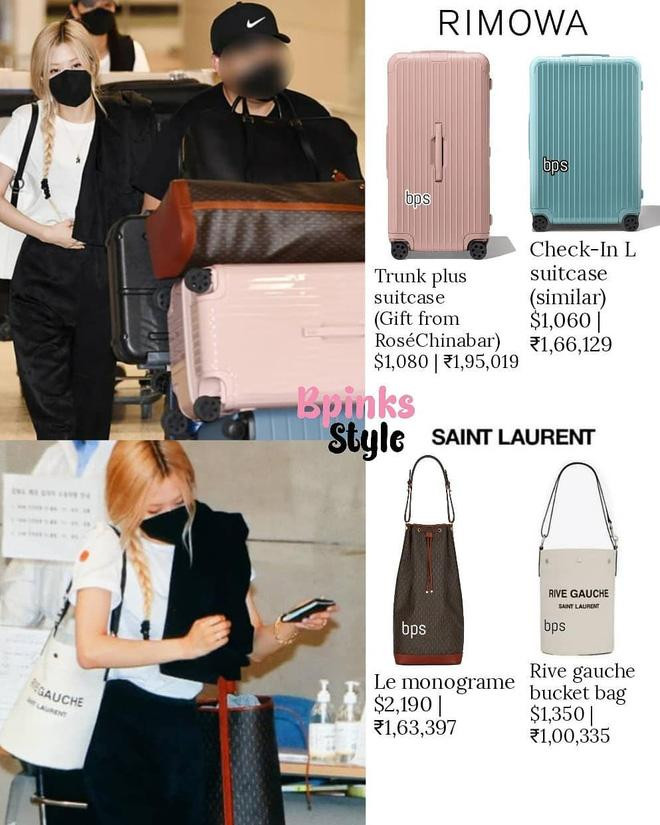 Rosé còn mang theo hai túi xách của Saint Laurent với giá tới gần 100 triệu. Bộ đôi va li hồng và xanh cỡ lớn của Rosé cũng có xuất xứ rất đặc biệt, là quà sinh nhật của fan Trung Quốc, giá mỗi chiếc cũng hơn nghìn đô (khoảng 23 triệu đồng). Tính tổng cộng thì Rosé đang khoác trên người khoảng 800 triệu đồng.