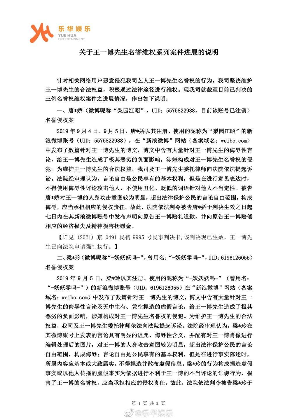 | Văn bản thông báo của Yuehua về các vụ kiện liên quan đến việc anti-fan xâm phạm danh dự của Vương Nhất Bác. |
