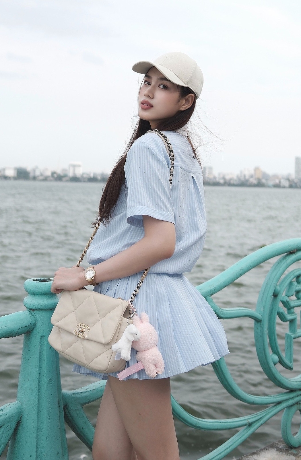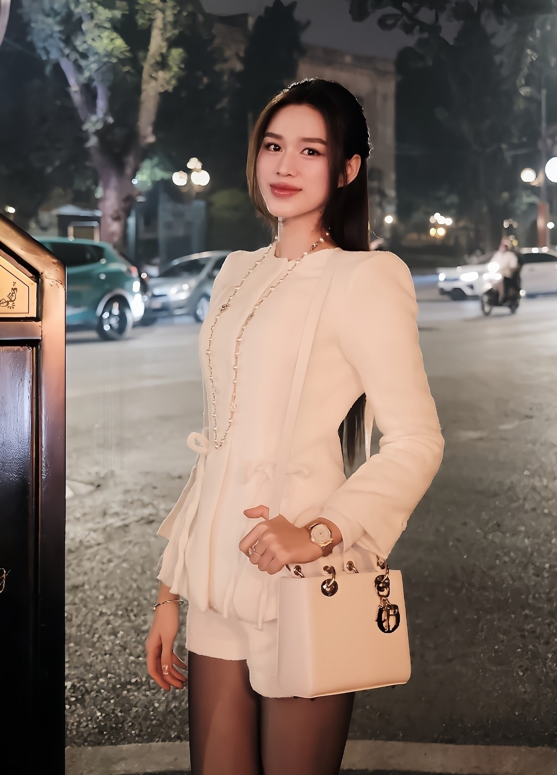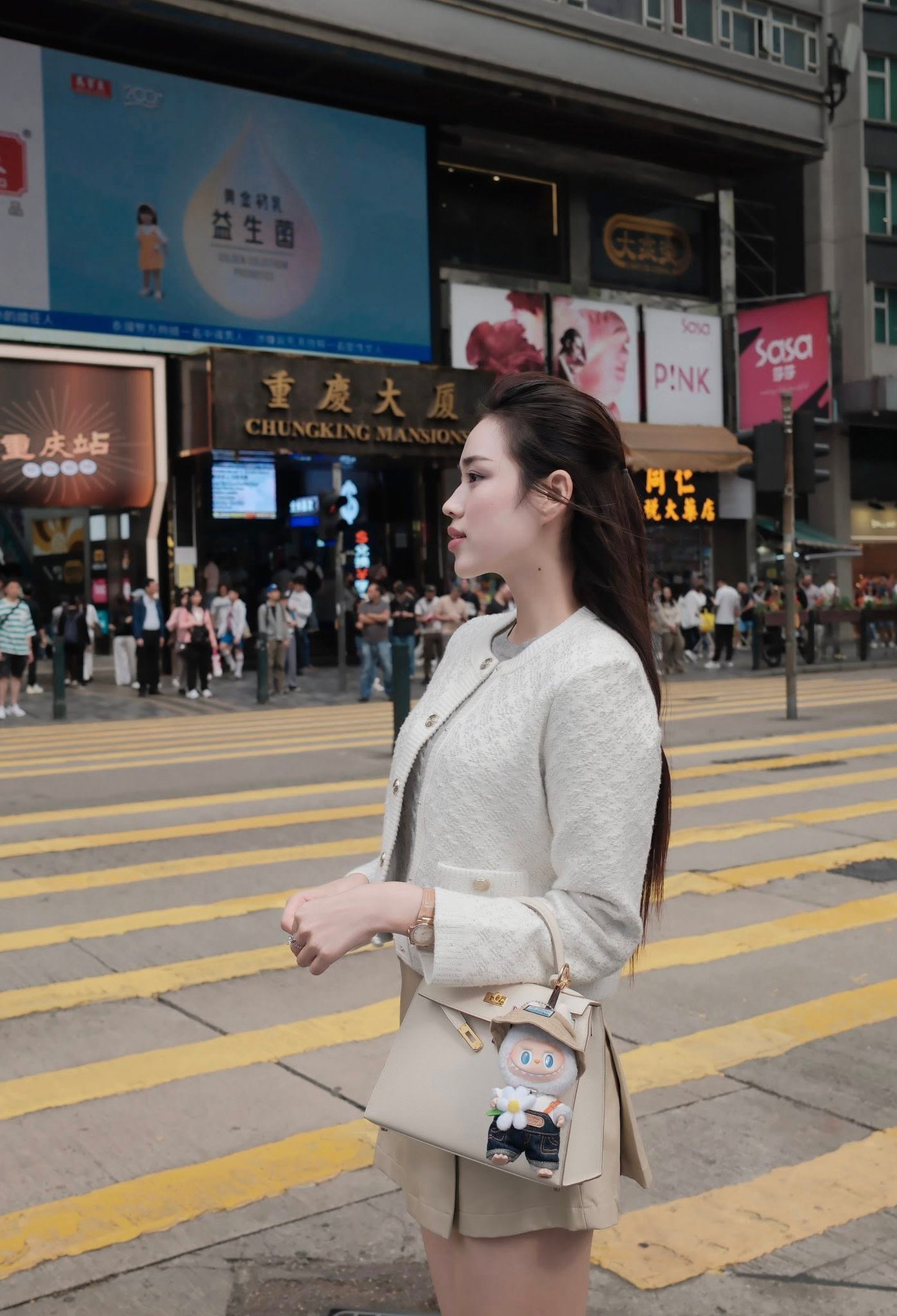 Điểm nhấn trên tay nàng hậu chính là chiếc túi Hermès Kelly màu kem, ước tính có giá khoảng 600 triệu đồng. Dù trào lưu đeo móc khóa Labubu đã hạ nhiệt thì Đỗ Thị Hà vẫn không quên treo thêm một em Labubu cho chiếc túi trở nên trẻ trung hơn. Hermès Kelly được xem là chiếc túi đắt giá nhất Đỗ Thị Hà sở hữu tính tới lúc này, và rất hợp với hình ảnh nữ doanh nhân thành đạt của nàng hậu.