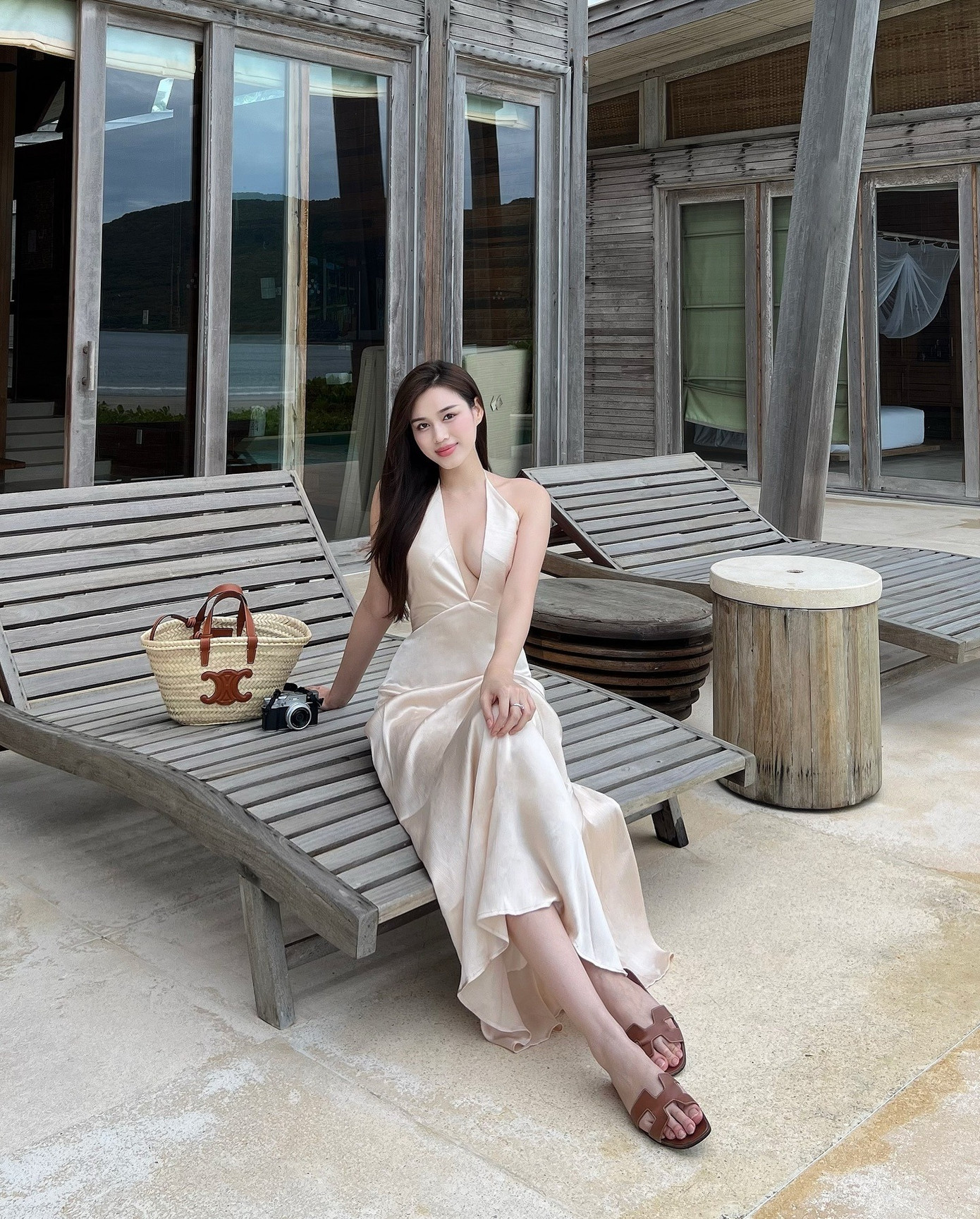 Ngay cả khi đi nghỉ dưỡng, Hoa hậu Đỗ Thị Hà cũng chọn chiếc túi cói màu be đến từ nhà mốt Celine, vô cùng ăn ý với bộ váy lụa mà nàng hậu đang mặc.