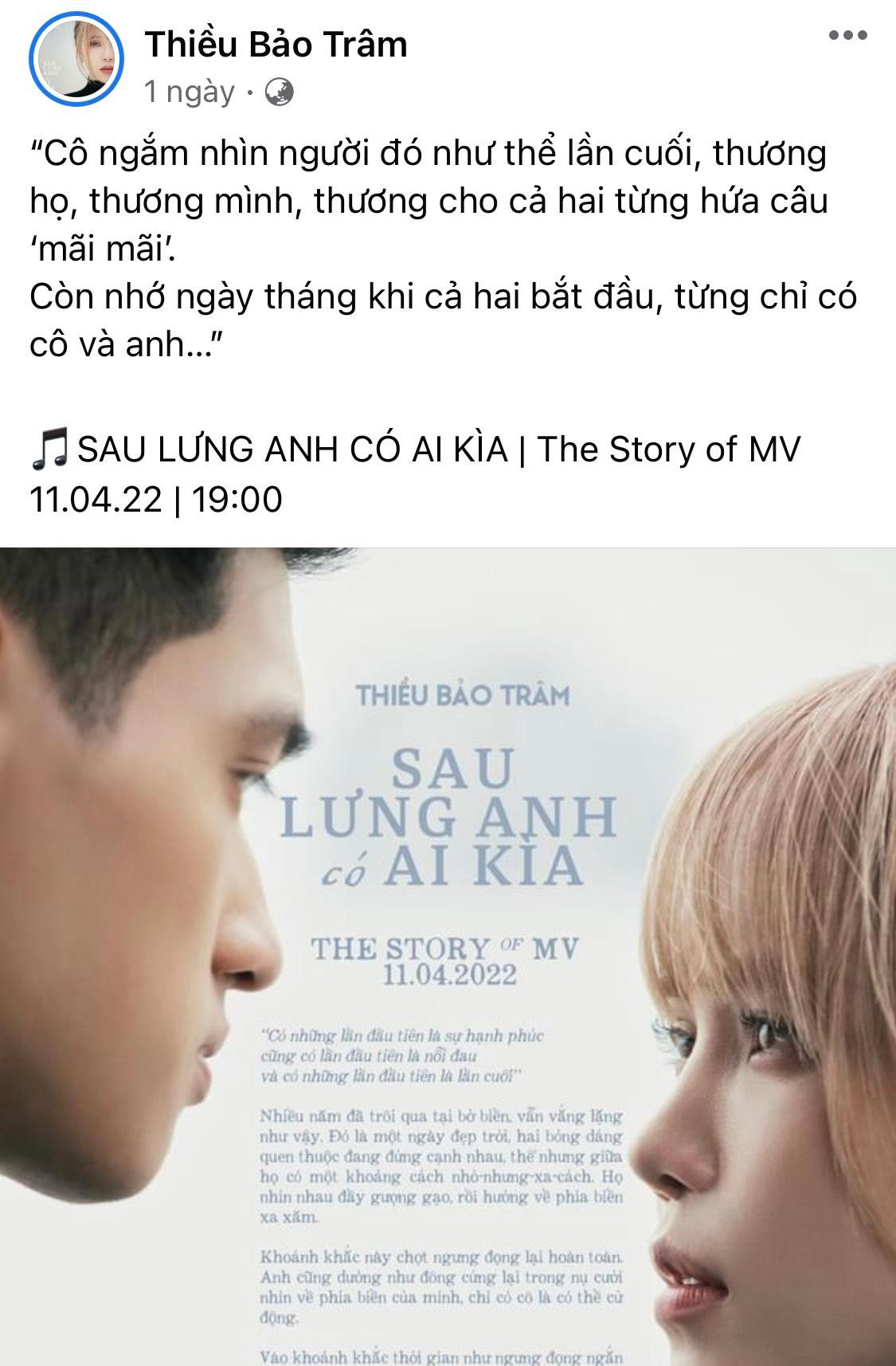 Bên cạnh đó, cộng đồng mạng cũng tinh ý "soi" ra dòng trạng thái quảng bá MV mới của Thiều Bảo Trâm. Cụ thể, trên trang cá nhân, nữ ca sĩ chia sẻ: "Cô ngắm nhìn người đó như thể lần cuối, thương họ, thương mình, thương cho cả hai từng hứa câu 'mãi mãi'. Còn nhớ ngày tháng khi cả hai bắt đầu, từng chỉ có cô và anh". Có thể thấy, giọng ca Love, Rosie sử dụng điệp từ "thương" đến ba lần và điều này lại khiến không ít người liên tưởng đến phát ngôn trước đó của Sơn Tùng M-TP.