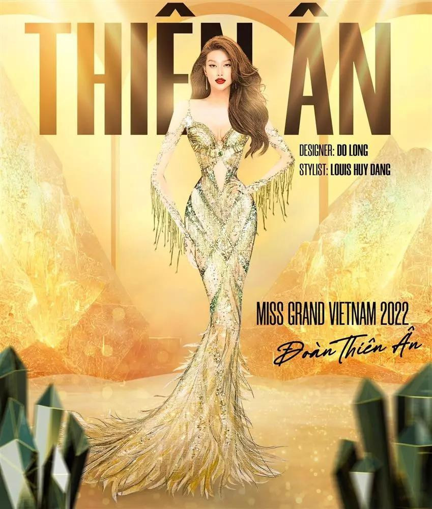 Bộ váy dạ hội của Thùy Tiên trong đêm Chung kết Miss Grand International 2021 mang tông xanh lá rất hợp với màu chủ đạo của chiếc vương miện. Trang phục dạ hội của Thiên Ân trong đêm Chung kết tối nay cũng pha trộn giữa màu vàng đồng và xanh ngọc lục bảo, gợi liên tưởng đến chiếc vương miện.
