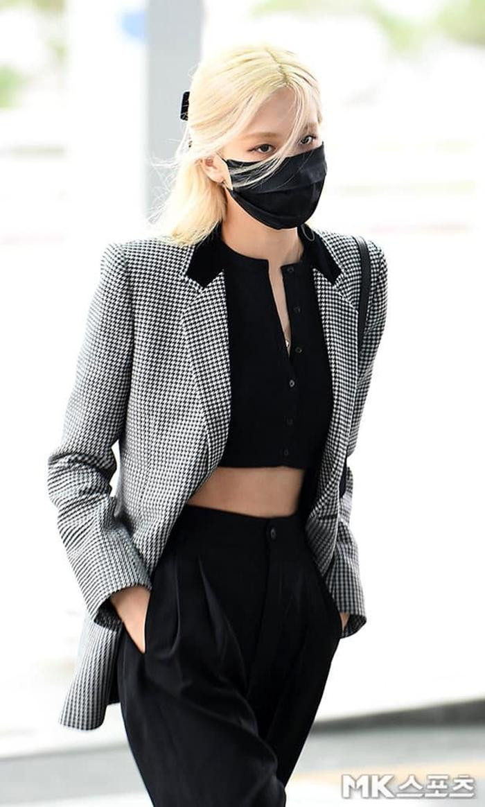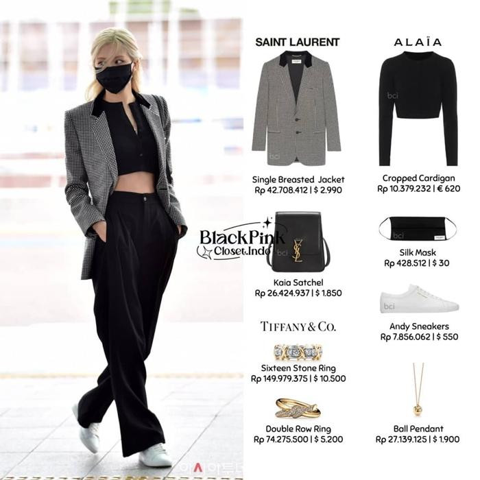 Rosé mặc set đồ với hầu hết trang phục thuộc hai nhãn hàng xa xỉ mà cô làm đại sứ thương hiệu là Saint Laurent và trang sức Tiffany & Co. Thời gian gần đây, Rosé rất thích phong cách mix áo crop-top và quần ống rộng, khoe vòng eo siêu nhỏ nổi tiếng và tỉ lệ cơ thể đẹp hoàn hảo. Chiếc áo blazer khoác ngoài càng giúp set đồ trông vô cùng thời trang.