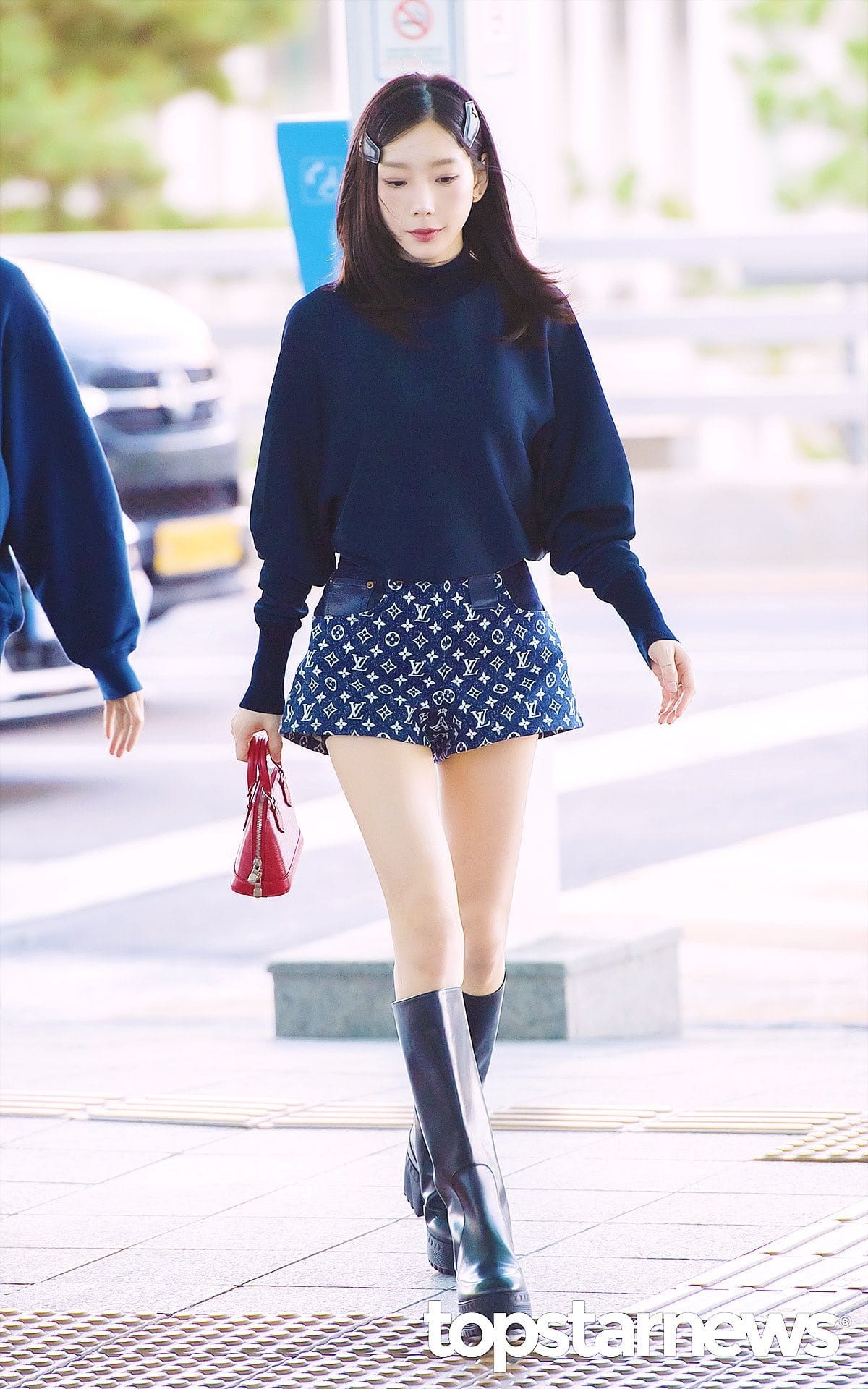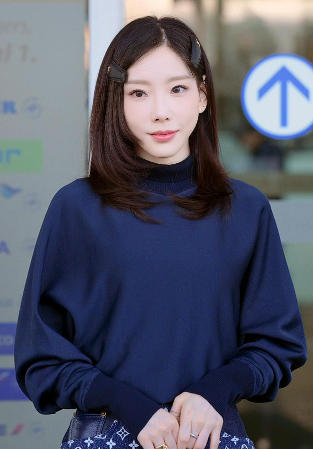 Xuất hiện ở sân bay khởi hành sang Paris, nữ ca sĩ chọn trang phục tông màu xanh navy. Trưởng nhóm SNSD chọn lối trang điểm nhẹ nhàng cùng kiểu tóc kẹp trẻ trung “hack tuổi”.