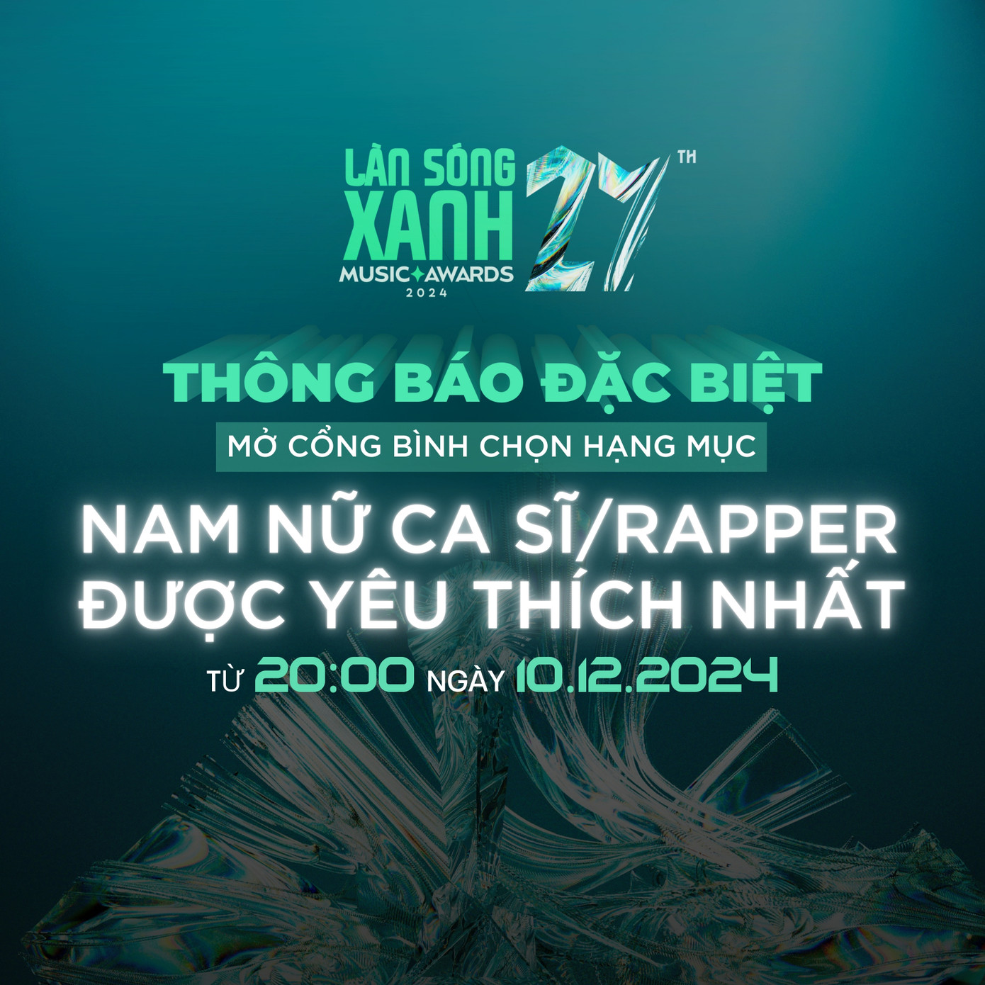 MC chương trình do Gil Lê, Tuyền Tăng dẫn dắt. Đêm trao giải Làn sóng xanh 2024 sẽ diễn ra vào ngày 15/1/2025, tại nhà thi đấu Nguyễn Du, TP. HCM.