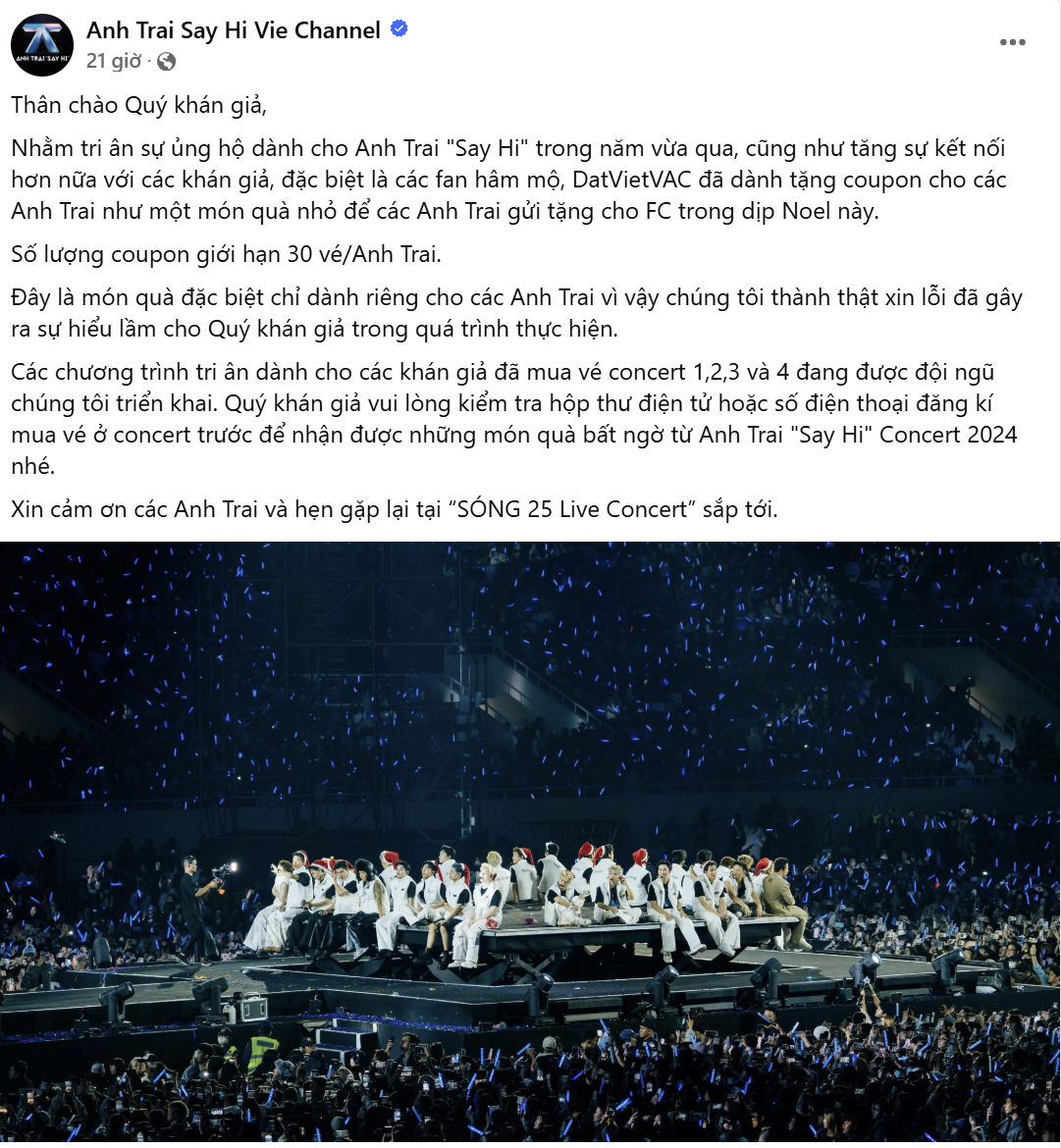 Ngày 25/12, fanpage Anh Trai "Say Hi" đăng tải bài viết nhằm giải tỏa căng thẳng, giải thích rằng coupon là món quà Noel tri ân FC của dàn "anh trai" vì sự ủng hộ nhiệt tình suốt năm qua. Bài viết cũng nhắc đến phúc lợi dành cho khán giả tham dự 4 đêm concert trước, do một số trải nghiệm chưa được như kỳ vọng. Tuy nhiên, nhiều ý kiến cho rằng chương trình đang "lạc đề". Vấn đề chính cần giải quyết là quyền lợi của những khán giả đã mua vé early bird.