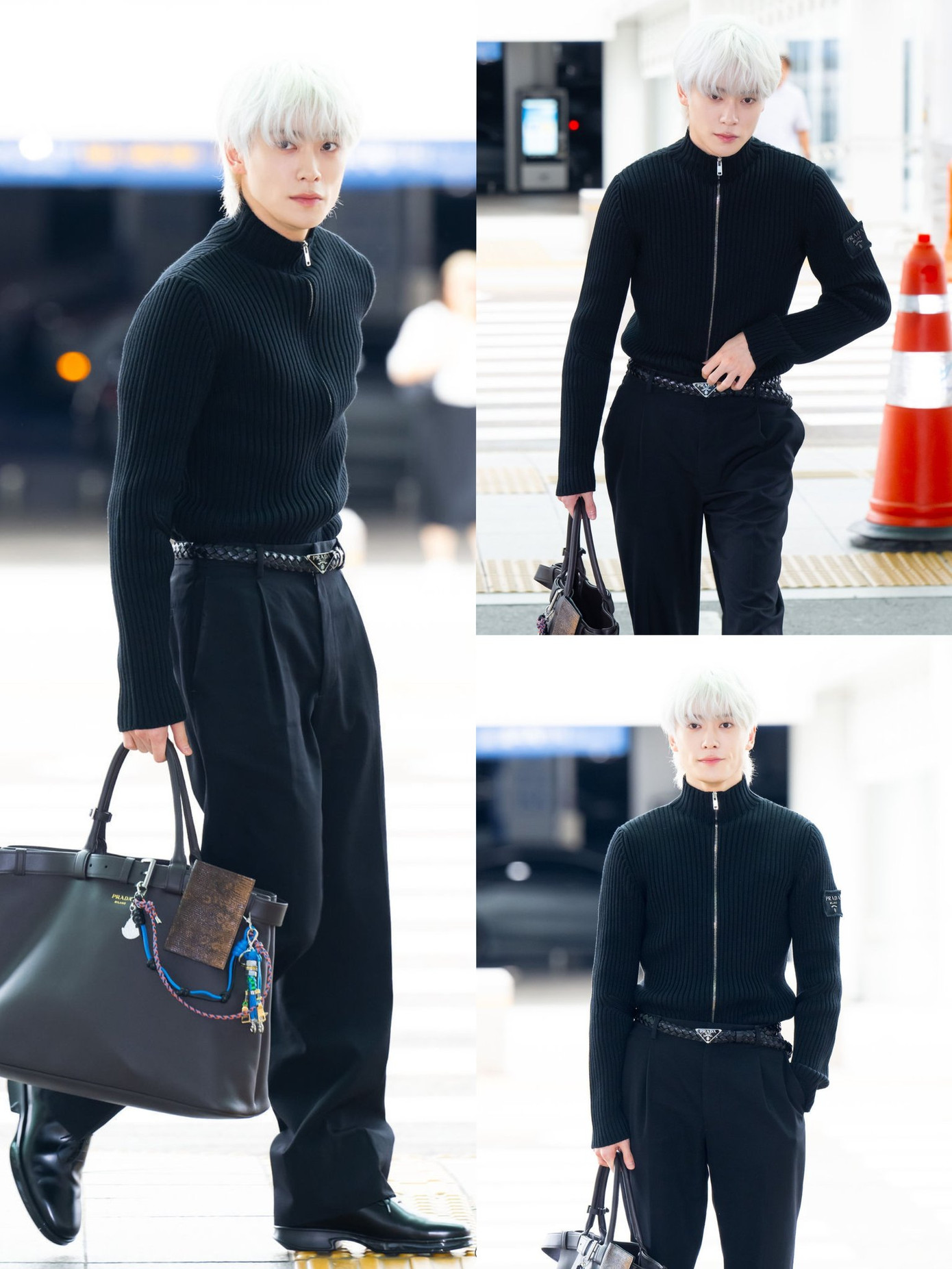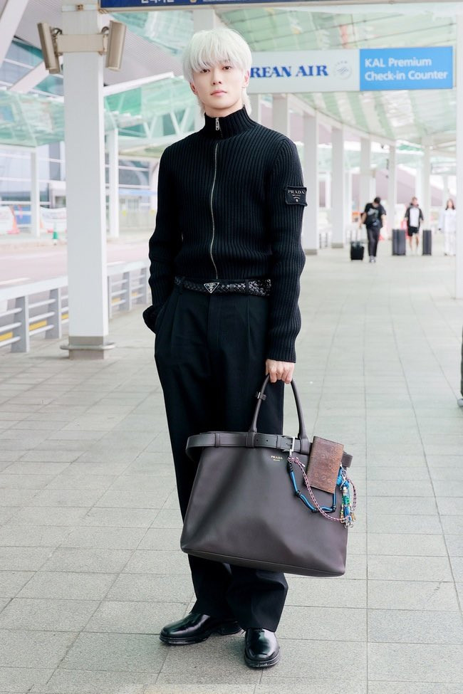 Anh diện trang phục nguyên cây đen với phần áo ôm vừa vặn tôn lên tỷ lệ cơ thể cân đối. Jaehyun NCT hoàn thiện tạo hình cùng thiết kế túi xách da cỡ lớn tông màu nâu.