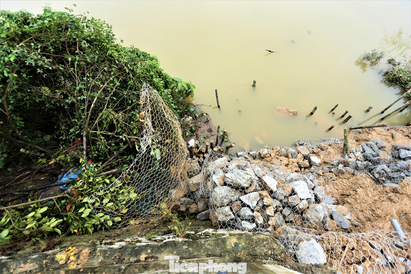 Cọc tre, rọ thép, đá hộc được gia cố để chống sạt lở.