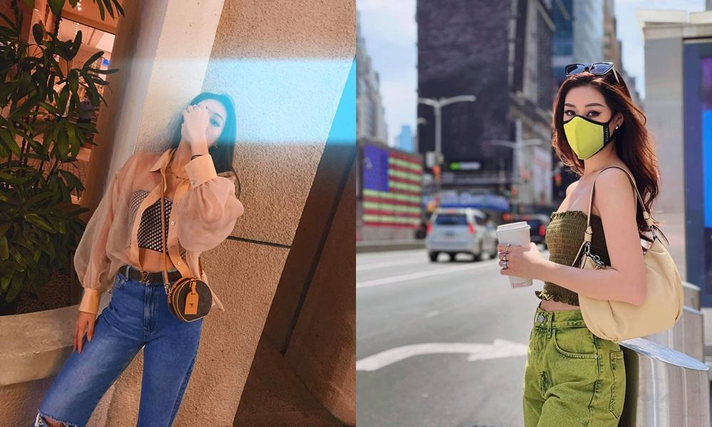 Trang phục đời thường yêu thích của Hoa hậu Khánh Vân là quần jeans và áo quây khoe vai thon. Cùng một phong cách nhưng Khánh Vân trên đất Mỹ nhìn thời trang và rất ấn tượng.