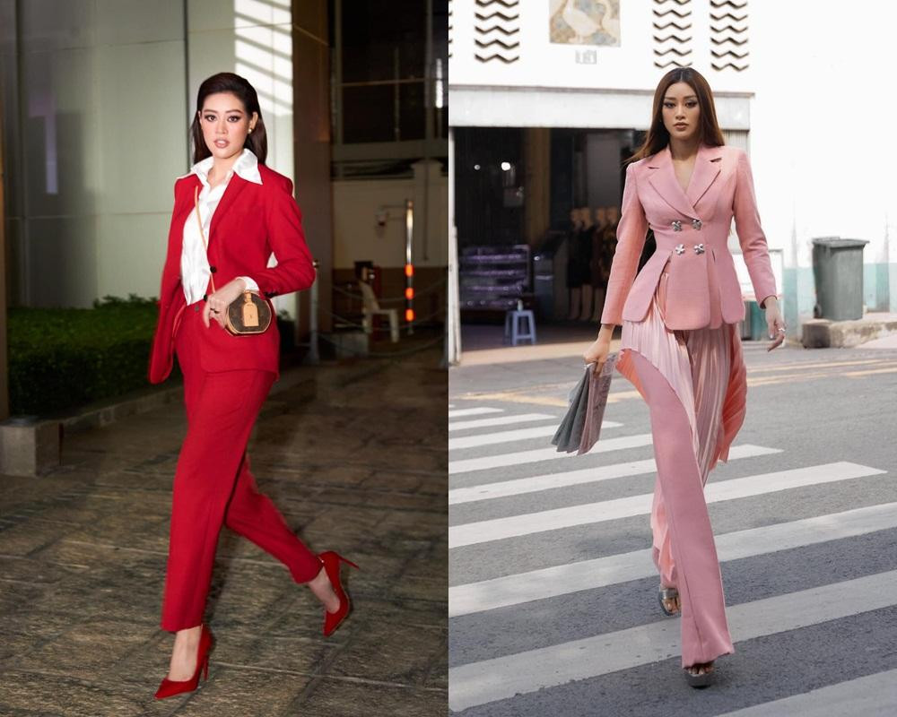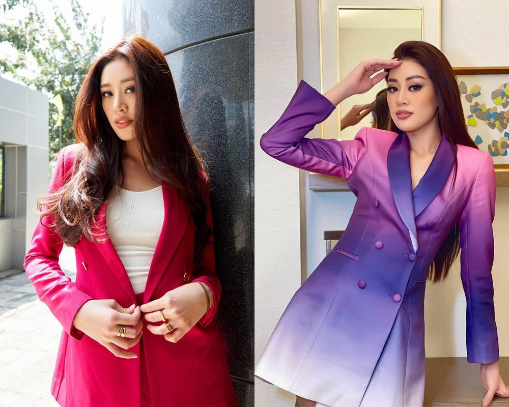 Cũng là bộ suit dáng dài nhưng đồ Hoa hậu Khánh Vân mặc trong cuộc thi nhìn bắt mắt, thời trang và tôn dáng hơn rất nhiều.