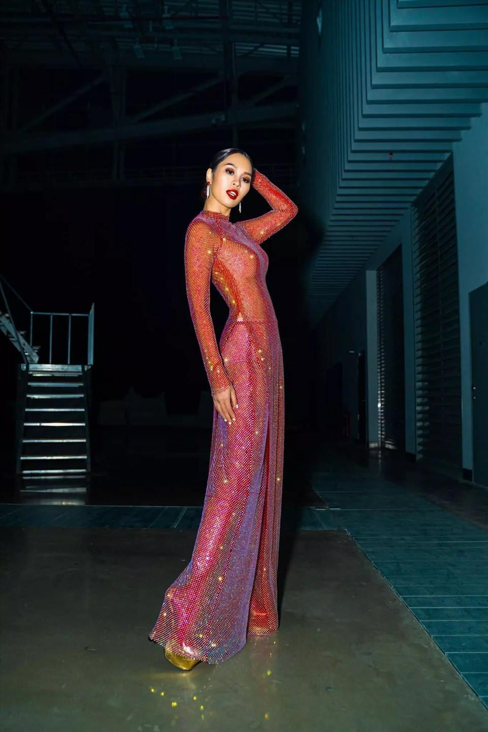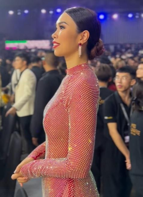 Đó là một mẫu trang phục có tông màu đỏ cam lấp lánh rất bắt mắt. Chất liệu vải mềm mại ôm sát cơ thể giúp Hà Anh khoe được đường cong hoàn mỹ của mình. Chỉ có điều khi tạo dáng dưới ánh đèn flash của máy ảnh, lớp vải mỏng manh xuyên thấu đã làm Hà Anh bị lộ rõ miếng dán ngực kém duyên.