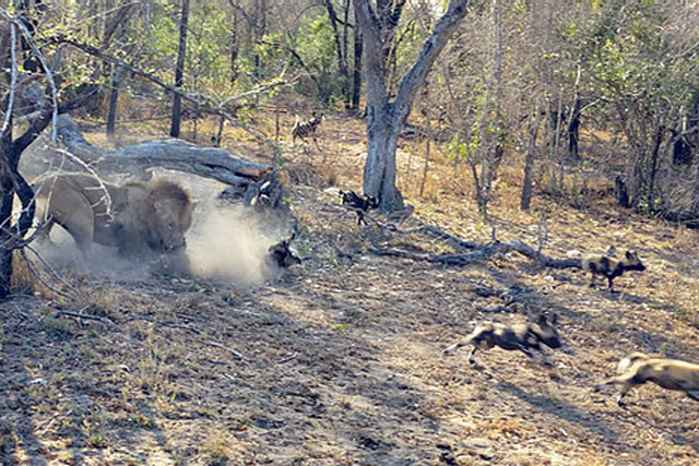 Với sự thù địch vốn có, sư tử liền lao lên tấn công và dễ dàng tóm gọn một chú chó hoang con kém may mắn. Trong khi đó, những con khác buộc phải bỏ chạy nhằm cố gắng thoát thân.