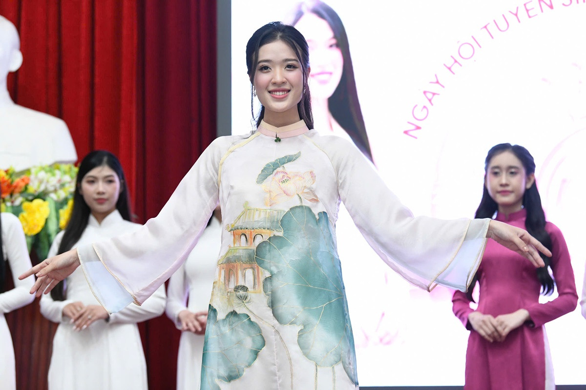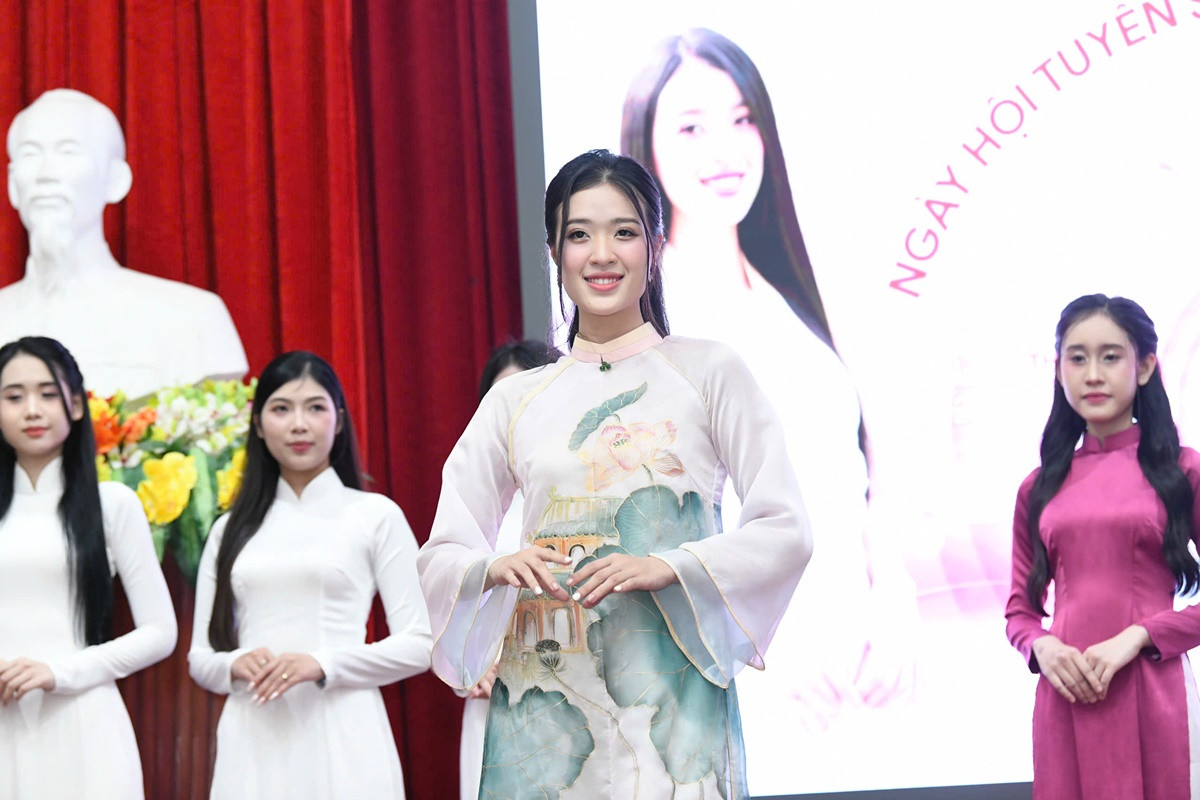 Dàn sinh viên đồng loạt mặc áo dài tham gia Ngày hội Tuyển sinh Hoa hậu Việt Nam 2024 tại Đại học Huế.