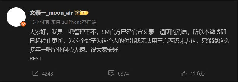"Xin chào mọi người, tôi là quản lý của trang. SM đã chính thức thông báo về việc Moon Taeil rút khỏi nhóm nên từ nay, tài khoản Weibo này sẽ ngừng cập nhật. Tôi không thể diễn tả rằng tôi đã bỏ bao nhiêu công sức cho trang này và người đó bằng lời nói. Chúng ta đến với nhau bằng tâm tư sáng trong nhất nhiều năm qua. Chúc các bạn mọi điều tốt đẹp nhất."