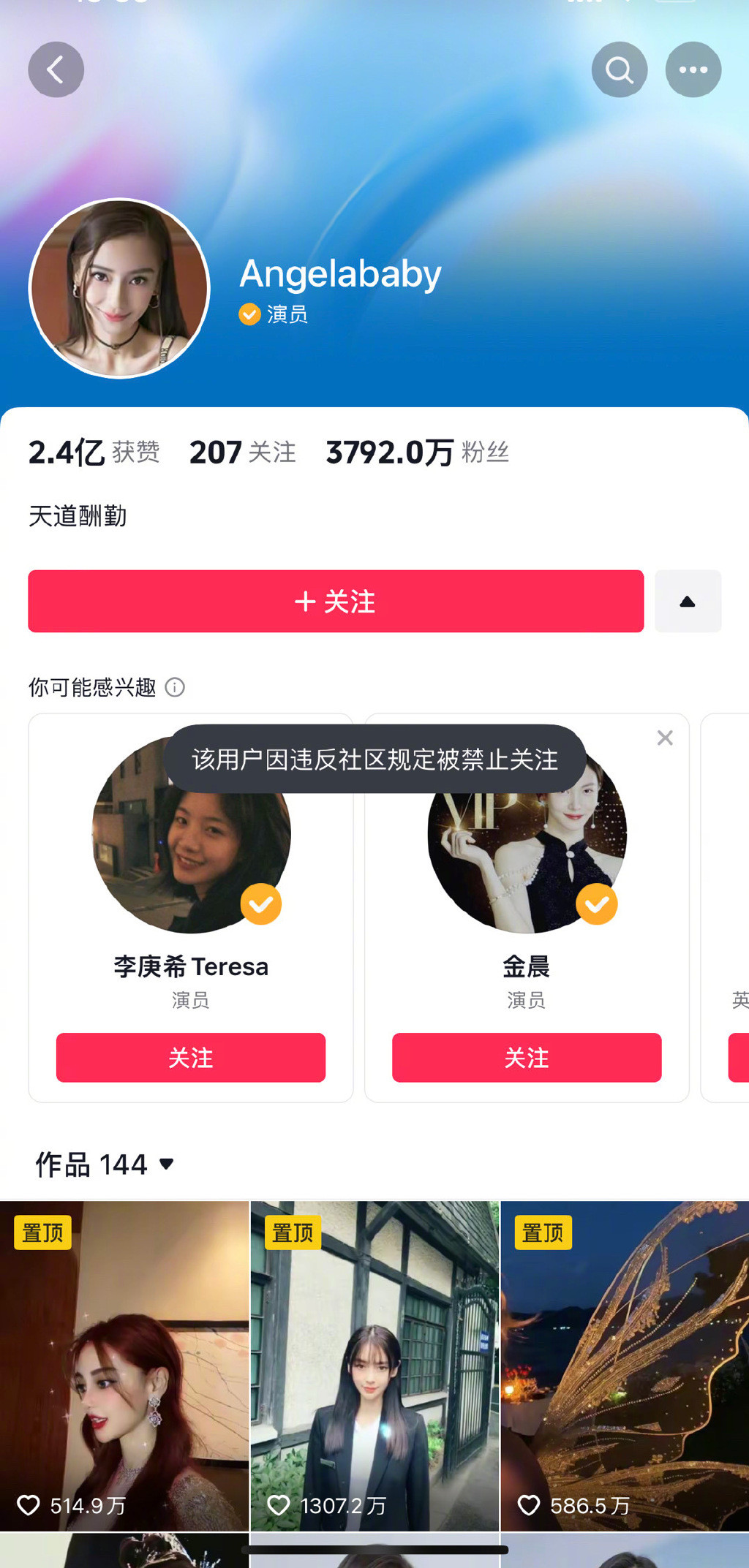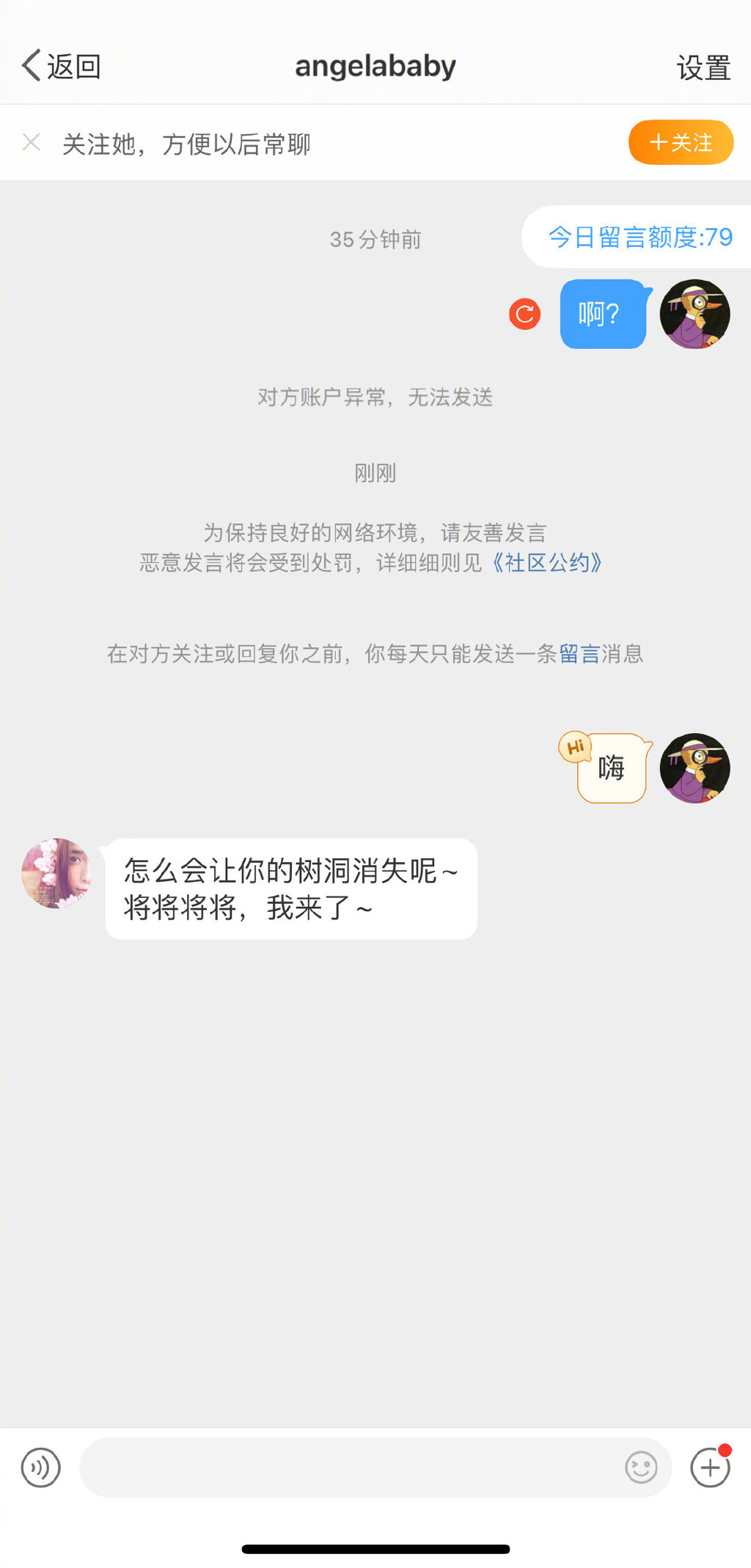 Trùng hợp, tài khoản Weibo của Angelababy và Trương Gia Nghê cũng "có biến". Hiện cả hai đều bị cấm follow vì vi phạm quy tắc cộng đồng, cũng không thể gửi tin tới tài khoản của 2 ngôi sao.