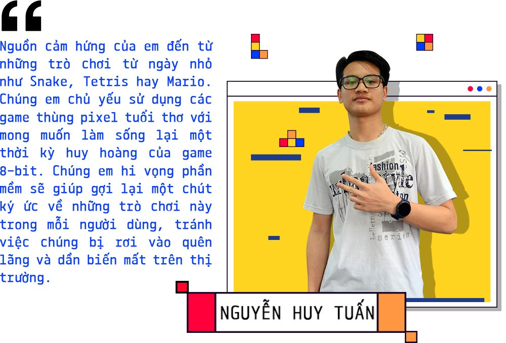Tuấn: Nguồn cảm hứng của em đến từ những trò chơi từ ngày nhỏ như Snake (Rắn săn mồi), Tetris (Xếp gạch) hay Mario. Vì vậy, khi xây dựng phần mềm này, chúng em chủ yếu sử dụng các game thùng pixel tuổi thơ với mong muốn làm sống lại một thời kỳ huy hoàng của game 8-bit. Chúng em hi vọng phần mềm sẽ giúp gợi lại một chút ký ức về những trò chơi này trong mỗi người dùng, tránh việc chúng bị rơi vào quên lãng và dần biến mất trên thị trường.