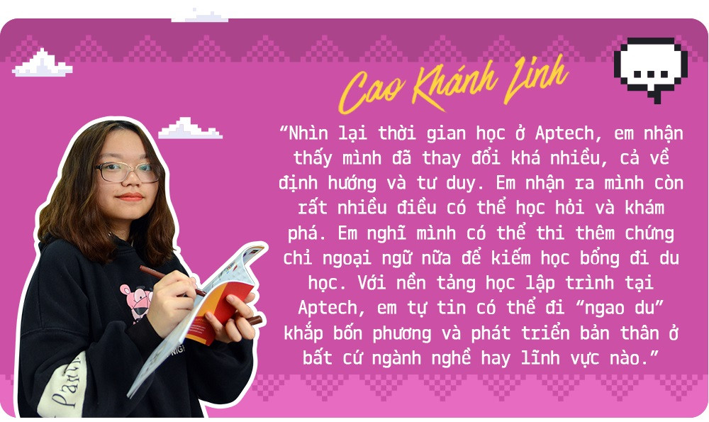 Linh: Nhìn lại thời gian học ở Aptech, em nhận thấy mình đã thay đổi khá nhiều, cả về định hướng và tư duy. Em nhận ra mình còn rất nhiều điều có thể học hỏi và khám phá. Em nghĩ mình có thể thi thêm chứng chỉ ngoại ngữ nữa để kiếm học bổng đi du học. Với nền tảng học Lập trình tại Aptech, em tự tin có thể đi “ngao du” khắp bốn phương và phát triển bản thân ở bất cứ ngành nghề hay lĩnh vực nào.