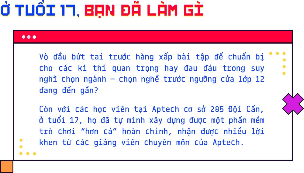 Có người đã từng nói “Nếu tất cả mọi người cùng nhau tiến về phía trước, thì thành công sẽ tự nhiên mà đến”. 3 cá nhân với 3 câu chuyện về sự khởi đầu và mục tiêu khác nhau nhưng từ lớp 10 đã cùng gặp gỡ và đồng hành trong lớp học THPT Công nghệ Quốc tế của Aptech, bắt tay và “nhào nặn” ra phần mềm trò chơi Game Over - một tổ hợp bao gồm nhiều game pixel, được giảng viên hướng dẫn nhận xét là “một ý tưởng rất ấn tượng trong một rừng ý tưởng về game đã quá đỗi nhàm chán”.