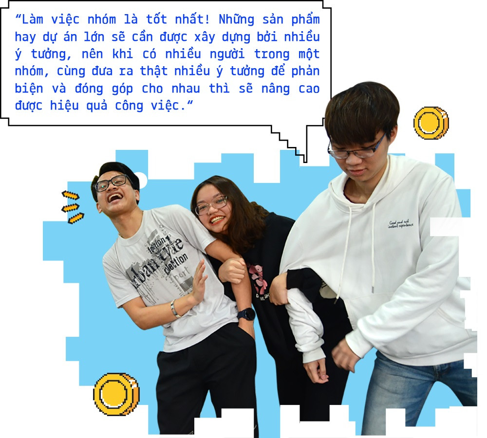 Duy Anh: Làm việc nhóm vẫn là tốt nhất! Những sản phẩm hay dự án lớn sẽ cần được xây dựng bởi nhiều ý tưởng, nên khi có nhiều người trong một nhóm, cùng đưa ra thật nhiều ý tưởng để phản biện và đóng góp cho nhau thì sẽ nâng cao được hiệu quả công việc. Hơn nữa, làm việc nhóm thì sẽ có người đi cùng mình, thôi thúc và tạo động lực cho mình làm việc, còn làm một mình chỉ có mình tự thúc mình mà thôi.