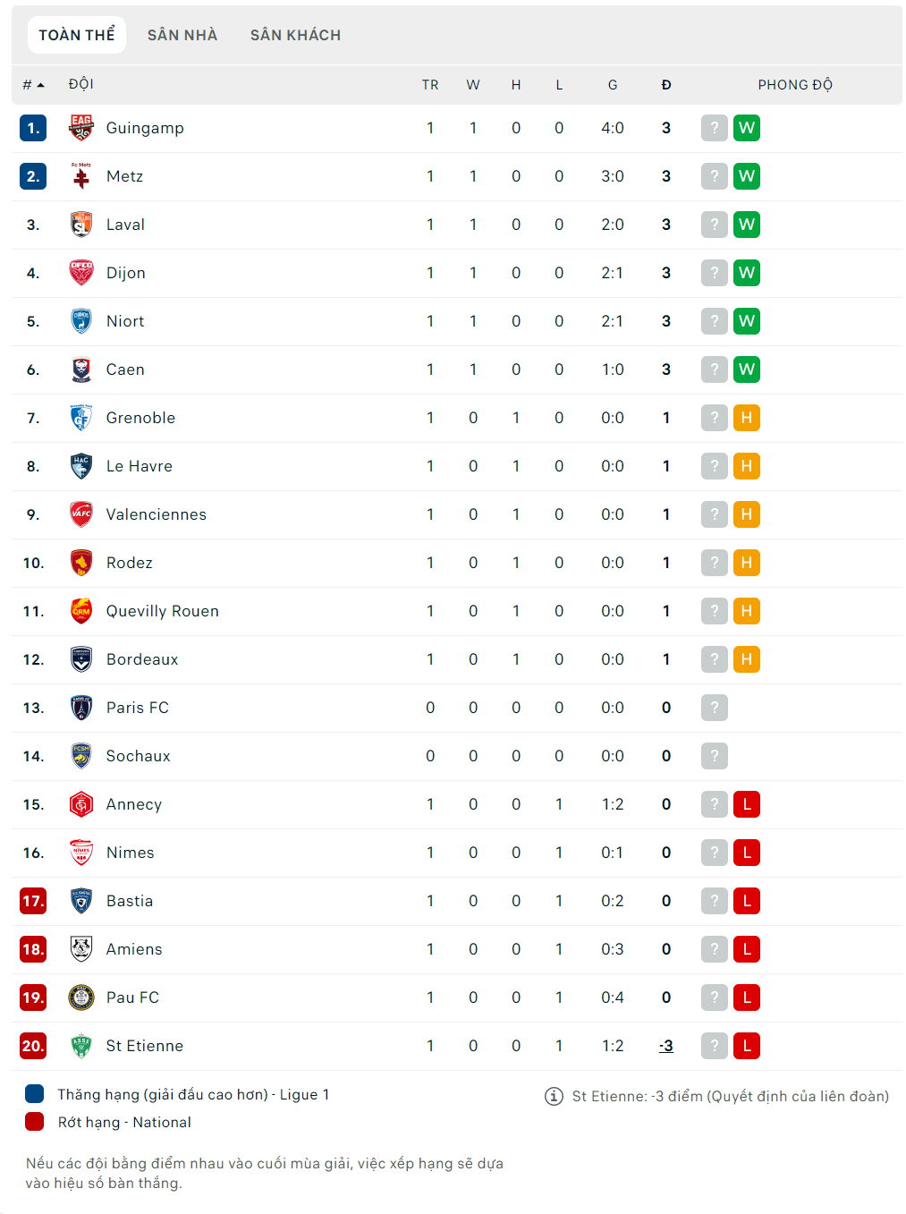 Sau loạt trận đêm qua, Pau FC chính là đội thua đậm nhất vòng 1 Ligue 2. Tuy nhiên, đội bóng của Quang Hải không rơi xuống bét bảng mà đứng thứ 19/20.