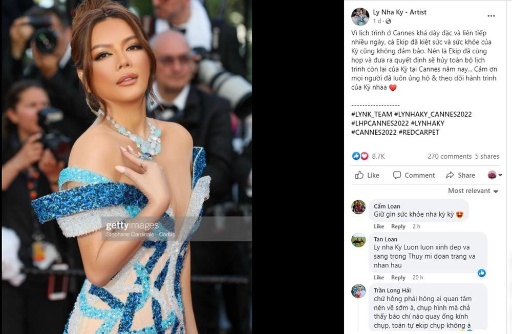 Tuy nhiên, tới ngày 24/5, người đẹp bất ngờ đăng thông báo: “Vì lịch trình ở Cannes khá dày đặc và liên tiếp nhiều ngày, cả ekip đã kiệt sức và sức khỏe của Kỳ cũng không đảm bảo. Nên là ekip đã cùng họp và đưa ra quyết định sẽ hủy toàn bộ lịch trình còn lại của Kỳ tại Cannes năm nay... Cảm ơn mọi người đã luôn ủng hộ & theo dõi hành trình của Kỳ nha.” Thông báo của người đẹp khiến không ít người hâm mộ tiếc nuối, nhưng cũng đồng tình vì lo cho sức khỏe của Lý Nhã Kỳ.