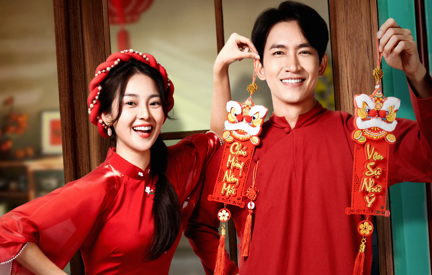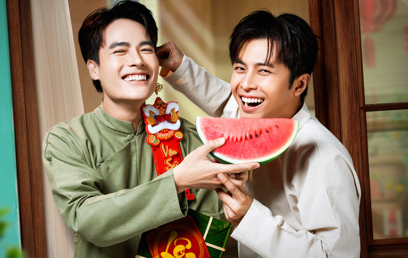 Trong khi, poster đôi của Gin Tuấn Kiệt - Võ Tấn Phát mang lại cảm giác hài hước, vui nhộn kèm thông điệp “có tâm – an, an tâm đón Tết”. Cả hai mặc áo dài với các vật phẩm đặc trưng ngày Tết như dưa hấu, bánh chưng và câu đối đỏ.
