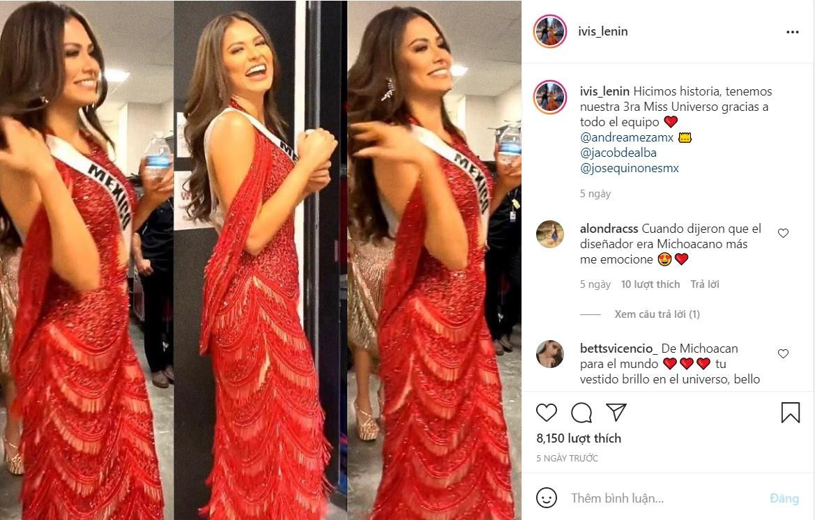 Hiện giờ, Hoa hậu Andrea Meza vẫn chưa có lời giải thích gì về sự trùng hợp khó hiểu này. Theo như ê-kíp của Hoa hậu giới thiệu, bộ váy dạ hội do nhà mốt Ivis Lenin của Mexico thiết kế. Mẫu váy được đính kết từ 40.000 viên pha lê, được làm bằng tay hoàn toàn và tốn gần một năm để hoàn thiện.