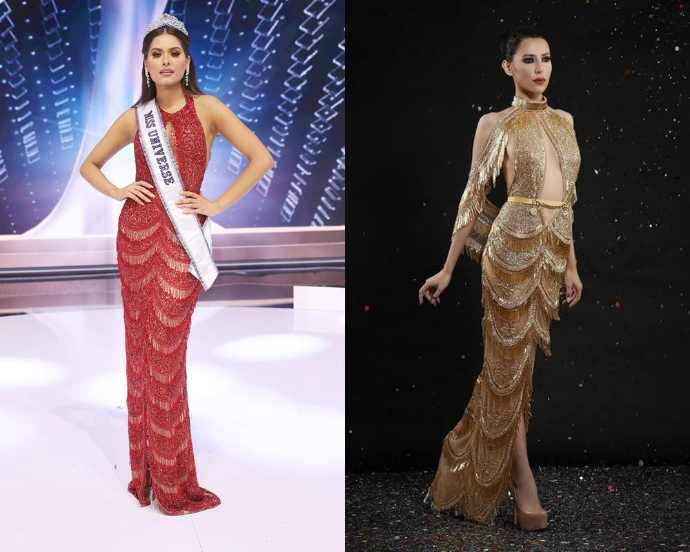 Mới đây nhất, cư dân mạng lại tranh cãi gay gắt xoay quanh bộ váy dạ hội mà tân Hoa hậu Hoàn vũ mặc trong đêm Chung kết là hàng đạo nhái. Công bằng mà nói, thiết kế này không quá lộng lẫy choáng ngợp nhưng rất bắt mắt và tôn dáng, giúp Andrea Meza tỏa sáng giữa dàn mỹ nữ.