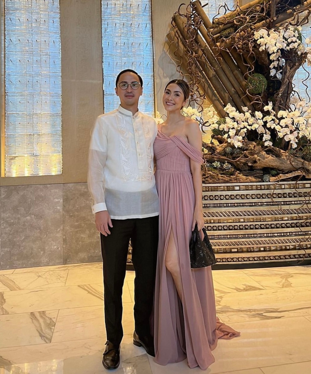 Nữ diễn viên chọn một bộ váy dạ hội màu hồng tro đúng như quy định của cô dâu chú rể, tối giản phụ kiện nhưng vẫn thu hút mọi ánh nhìn. Hà Tăng rất khéo chọn bộ váy mềm mại giúp cô khoe được bờ vai nhỏ nhắn, vóc dáng mảnh mai.