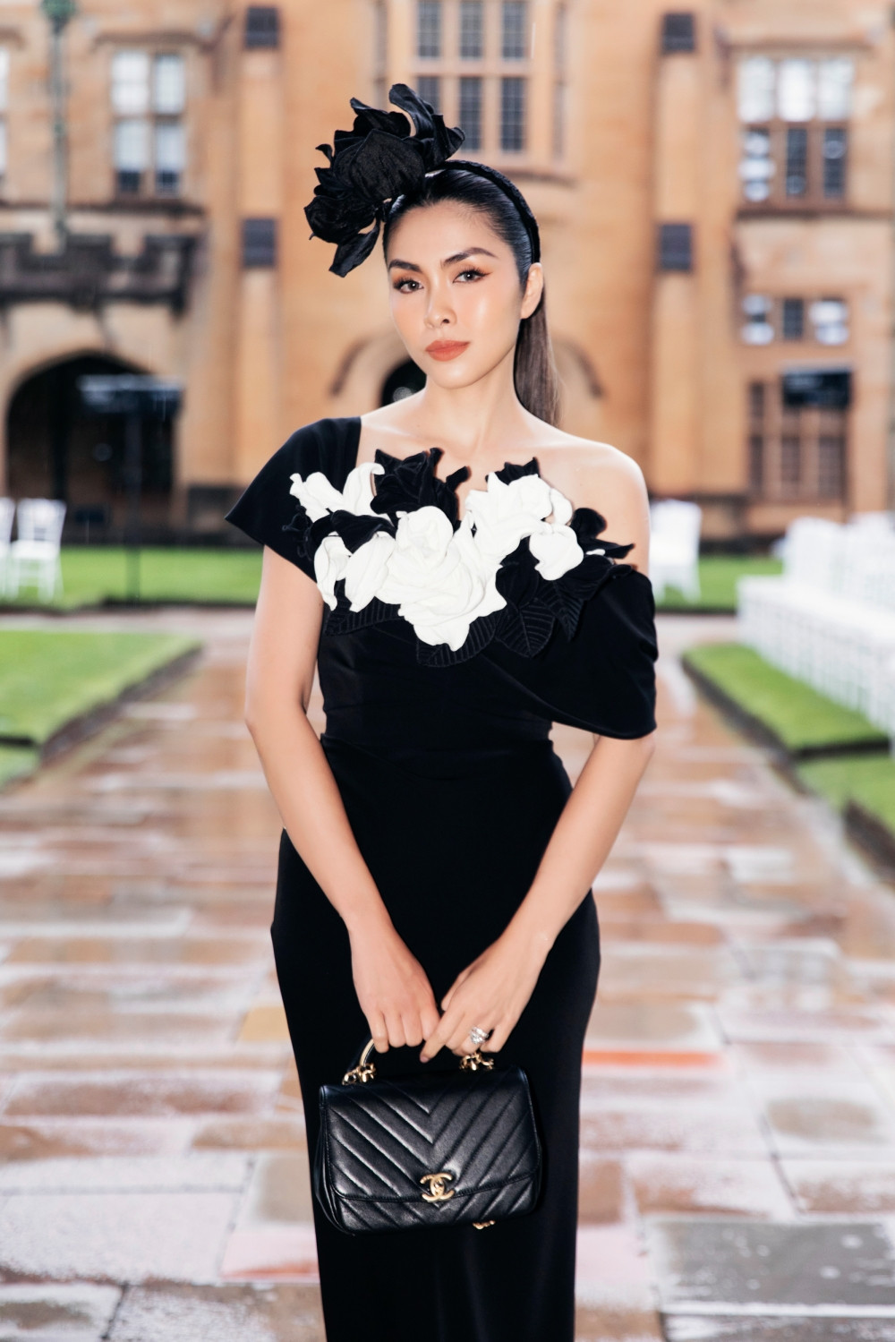 Diễn viên Tăng Thanh Hà diện đầm đen lệch vai tối giản, có chi tiết hoa 3D với 2 tông màu đen, trắng tương phản, phối cùng túi Chanel thiết kế cổ điển.